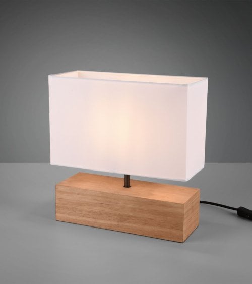 Su base rectangular está elaborada en madera clara, probablemente roble o abedul, que aporta calidez y estabilidad. La estructura se complementa con un pie delgado de metal negro que sostiene una pantalla rectangular de tela blanca texturizada, creando un contraste elegante y minimalista. Esta combinación hace que la lámpara encaje perfectamente en ambientes modernos o con inspiración escandinava.