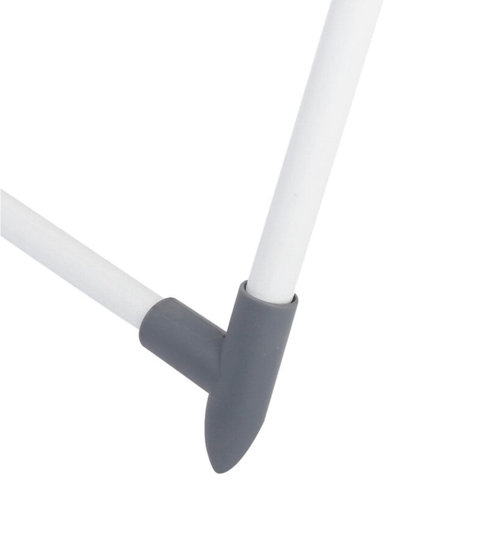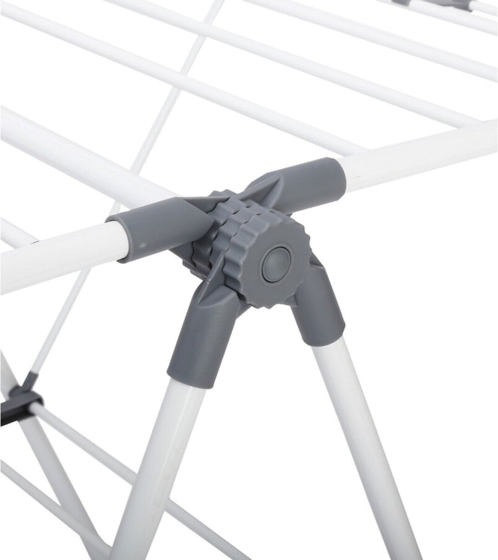 Este tendedero es metálico y cuenta con refuerzos de polipropileno además de disponer en su base de unos pies antideslizantes, que evitan cualquier tipo de deslizamiento. Contiene unos clips de seguridad para evitar que las alas se plieguen inesperadamente.