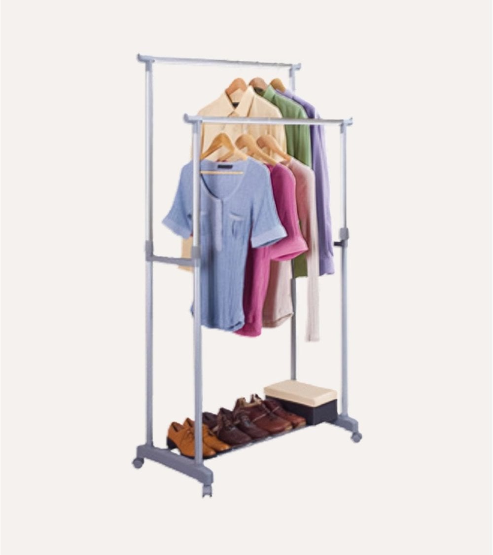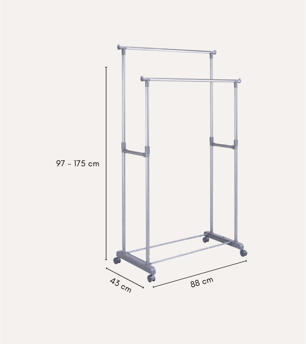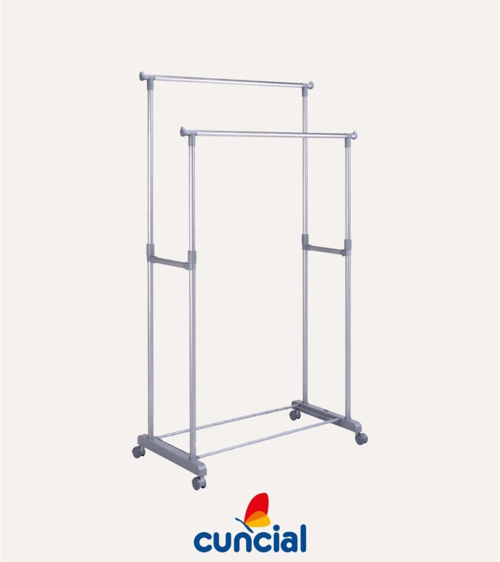 Su diseño con doble barra colgadora permite separar prendas por tipo, temporada o usuario, aprovechando al máximo el espacio vertical. Gracias a su altura regulable, puedes colgar desde camisas y chaquetas hasta vestidos largos o abrigos, evitando que se arruguen. El acabado metálico en tono moderno se integra fácilmente en cualquier estilo de decoración, desde ambientes juveniles hasta espacios más sobrios.