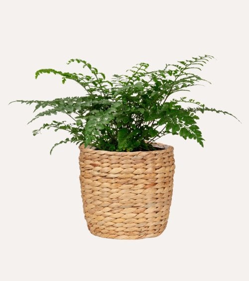 La maceta está elaborada con una combinación de fibra vegetal y plástico, lo que garantiza durabilidad y resistencia frente a las condiciones ambientales, sin perder ese encanto artesanal que aporta la textura natural del jacinto de agua. Su diseño cilíndrico con bordes redondeados ofrece un aspecto suave y acogedor, mientras que el forro interior plástico protege la fibra, permitiendo su uso como contenedor para plantas sin riesgo de humedad o deterioro.