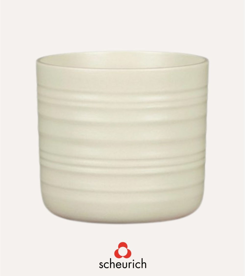El diseño cilíndrico con borde ligeramente ensanchado crea una silueta equilibrada, mientras que las sutiles líneas horizontales en relieve envuelven toda la superficie exterior, añadiendo un detalle visual único y mejorando el agarre. Su color neutro, cercano al beige claro o blanco roto, facilita su integración en cualquier paleta cromática sin perder protagonismo.