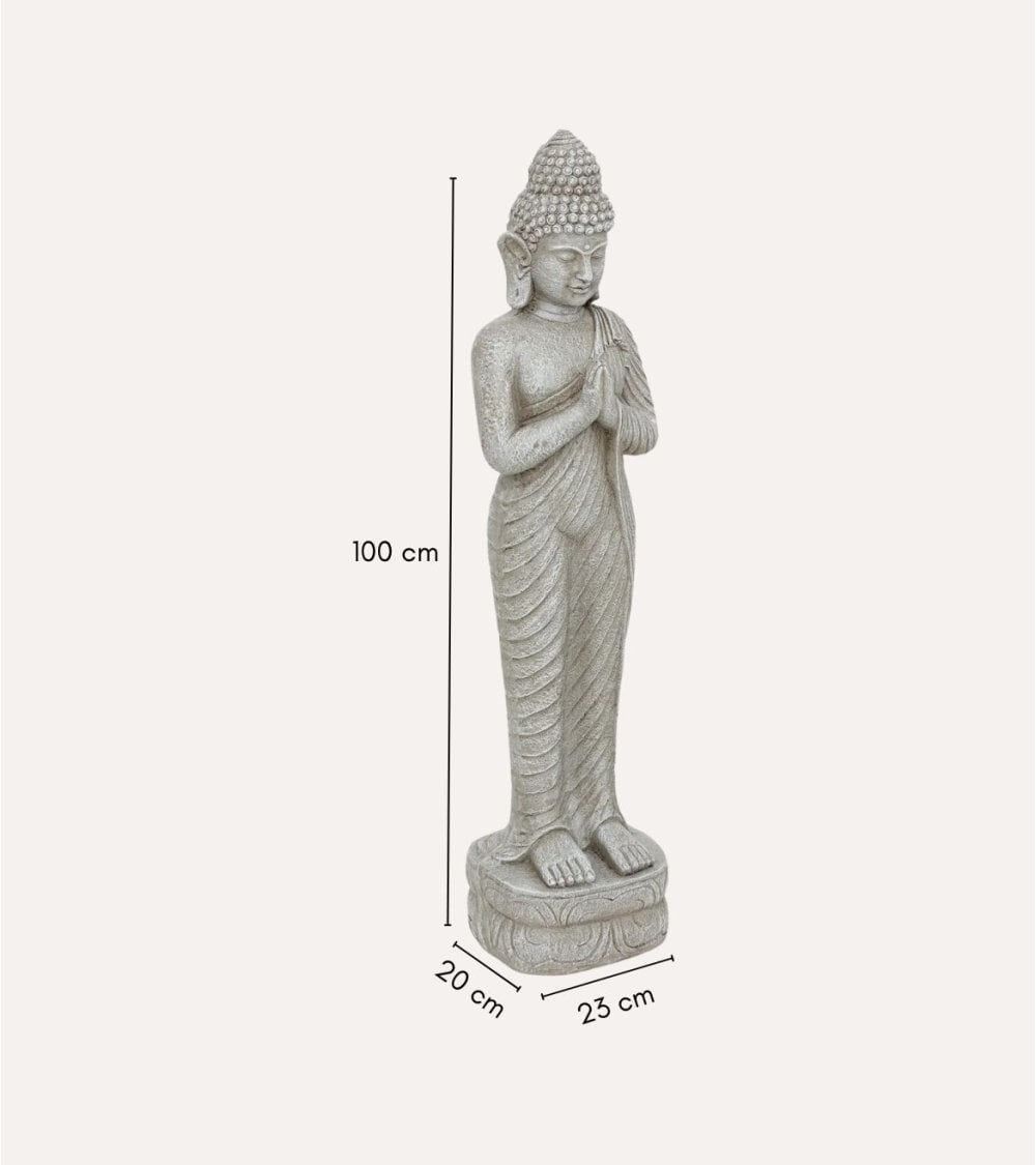 - Diseño: Figura tradicional budista con postura de pie y manos en anjali mudra.