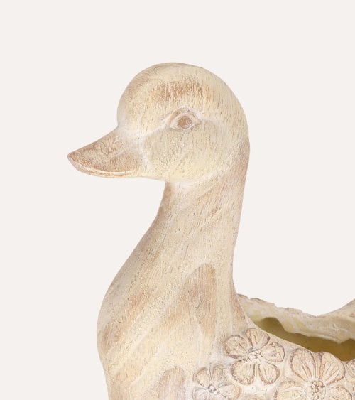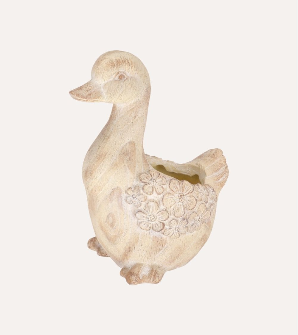 La parte superior del pato forma un práctico espacio para plantas, perfecto para suculentas, plantas pequeñas o flores. El relieve floral en uno de sus laterales aporta textura y elegancia, creando un diseño que encaja a la perfección en ambientes rústicos, farmhouse, nórdicos o shabby chic. Gracias a su construcción en magnesia, es apto tanto para interior como para exterior protegido, manteniendo su apariencia durante más tiempo.