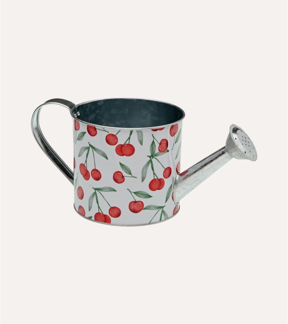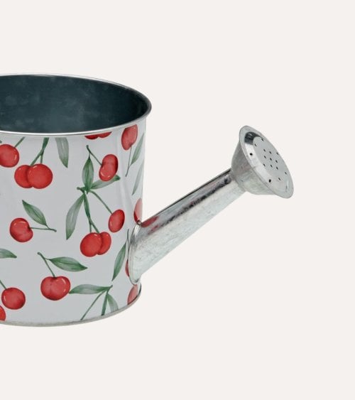 Gracias a su diseño ergonómico, con asa lateral metálica y boquilla perforada, permite una distribución suave y uniforme del agua, cuidando plantas delicadas tanto en interior como en exterior. Su estructura de metal facilita la durabilidad y la estabilidad, mientras que el acabado liso esmaltado con estampado de cerezas aporta un toque divertido y original a cualquier rincón de tu hogar.