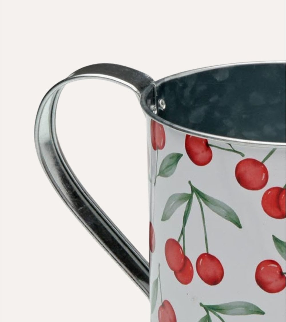 Su cuerpo metálico en color blanco está decorado con un alegre estampado de cerezas rojas y hojas verdes, ideal para ambientes de estilo rústico, vintage o cottage. Esta regadera no solo sirve para regar tus plantas con comodidad, sino que también funciona como objeto decorativo: puedes utilizarla como florero, centro de mesa o complemento en estanterías, balcones y porches.