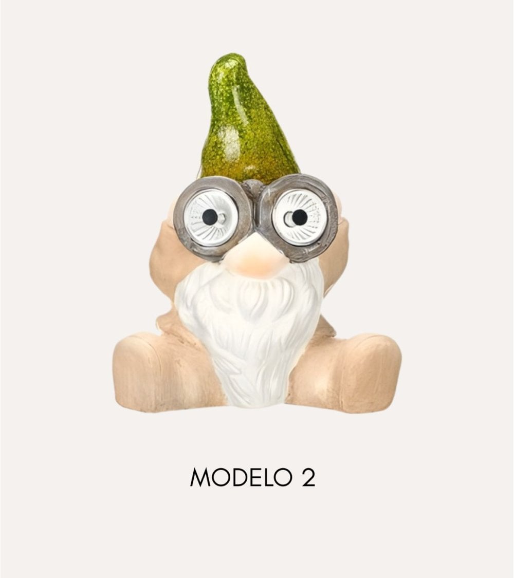 Disponible en dos variantes de diseño, podrás elegir entre el gnomo con cuerpo en tono melocotón/beige (Modelo 1) o el gnomo con cuerpo en gris suave (Modelo 2). Ambos modelos comparten un simpático estilo nórdico, con grandes ojos expresivos en blanco y negro, frondosa barba blanca y una característica gorra verde con acabado brillante y efecto purpurina en forma de pera, que aporta un toque de fantasía a cualquier rincón exterior o interior.