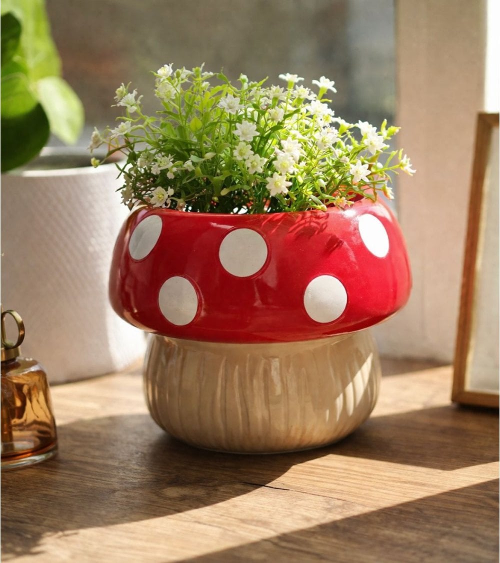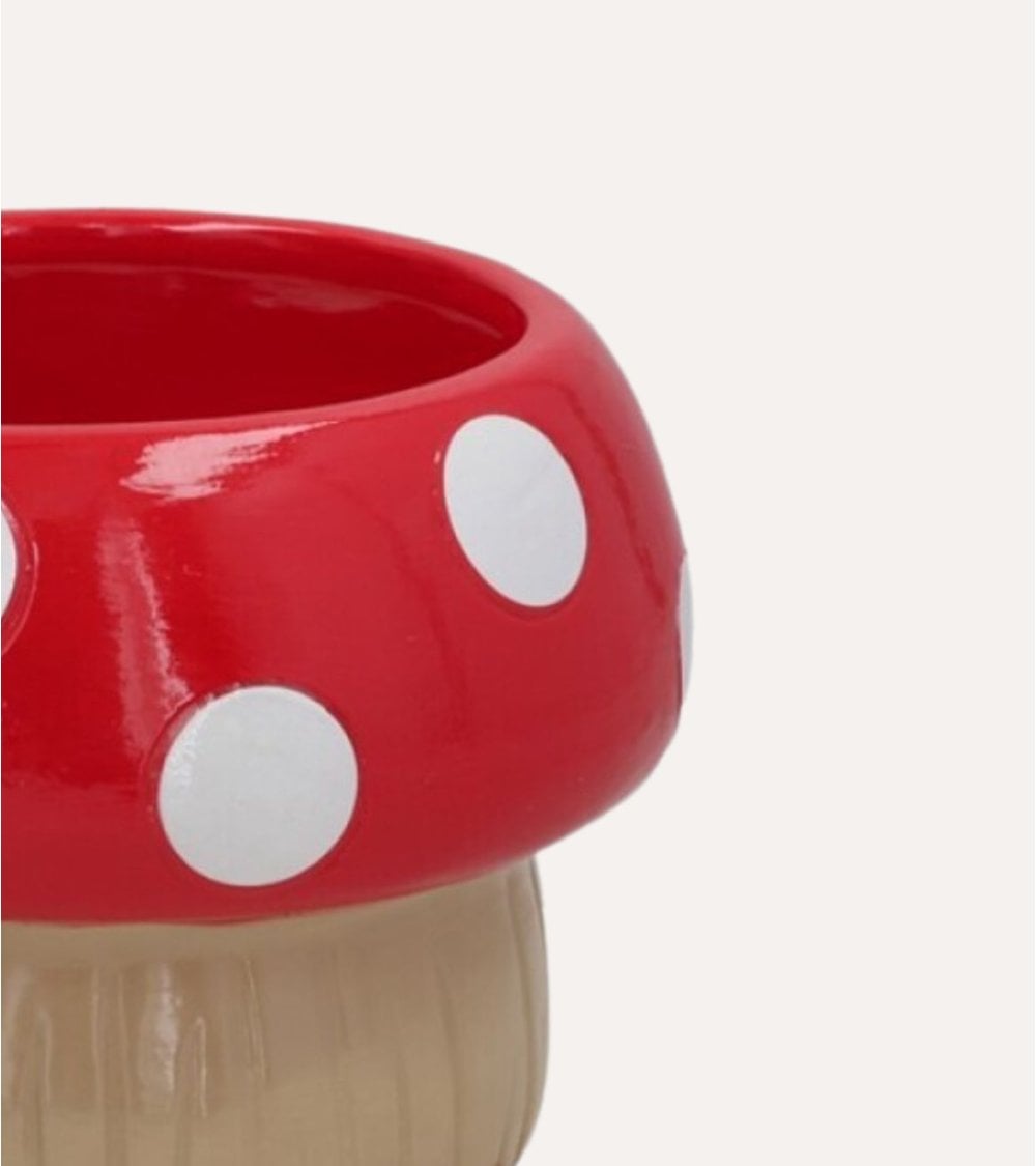 Su llamativa parte superior en forma de seta, con un capuchón rojo brillante salpicado de lunares blancos, contrasta con el tono beige suave del tallo, creando un efecto visual muy decorativo. Gracias a su acabado esmaltado, este macetero decorativo resulta fácil de limpiar y mantiene su color vivo con el paso del tiempo, incluso colocado en zonas bien iluminadas o terrazas cubiertas.