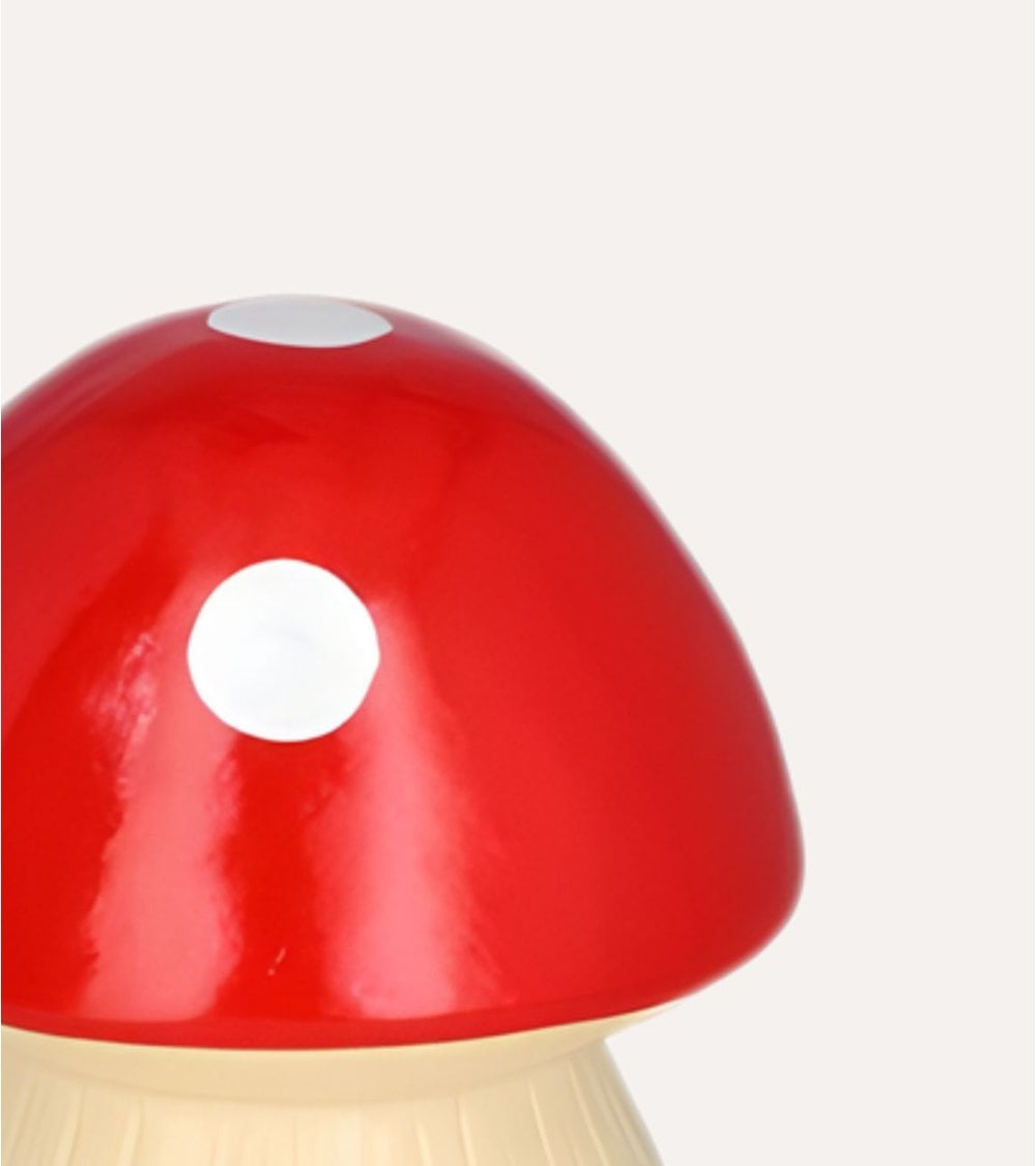 - Diseño: seta roja con lunares blancos y mariquita decorativa para un estilo de cuento.