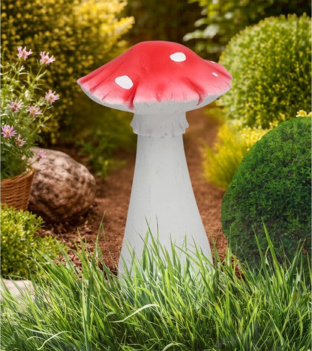Fabricada en resistente magnesia, esta seta decorativa ofrece una gran durabilidad frente al paso del tiempo. Su superficie lisa y no porosa facilita la limpieza y el mantenimiento, conservando sus colores vivos y detalles decorativos durante más tiempo. El contraste entre el sombrero rojo con lunares blancos y el tallo claro aporta un aire alegre y desenfadado, perfecto para crear pequeñas escenas de cuento, jardines de hadas o composiciones junto a macetas y plantas naturales.