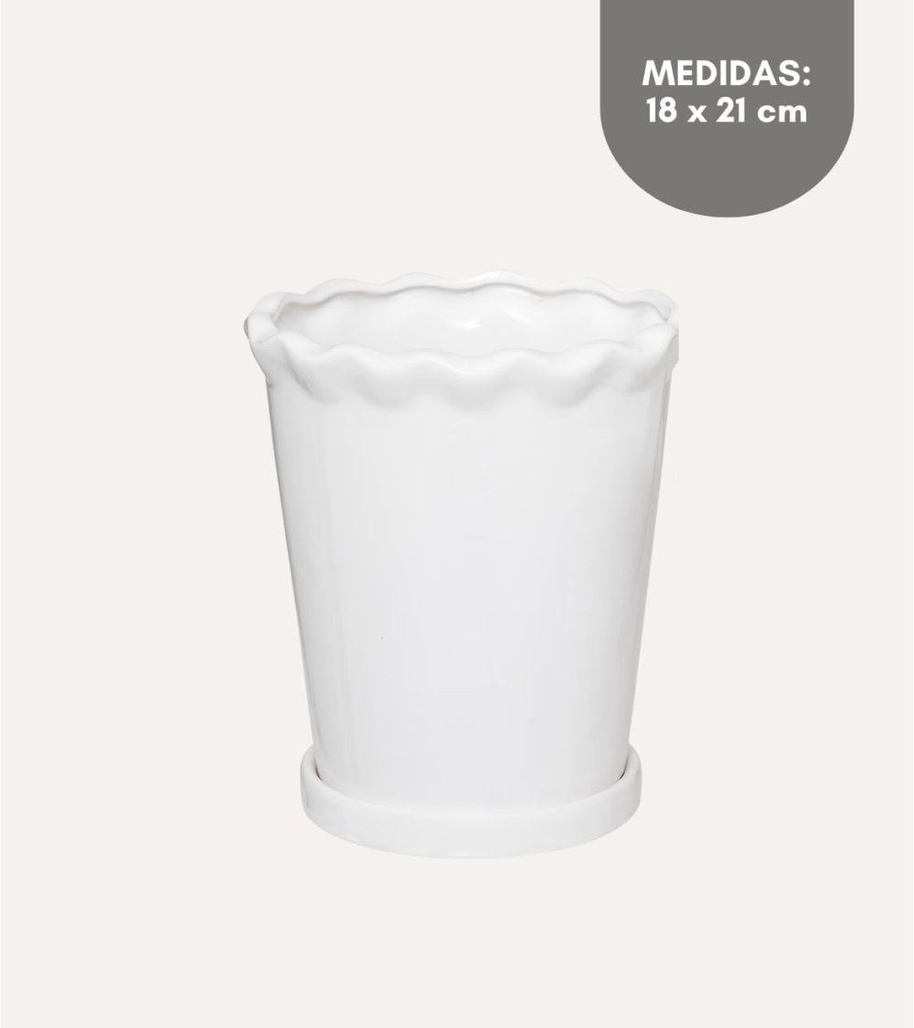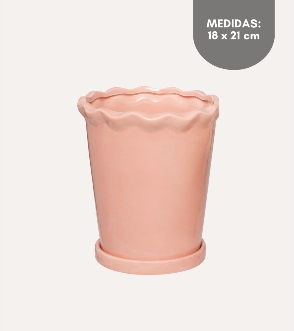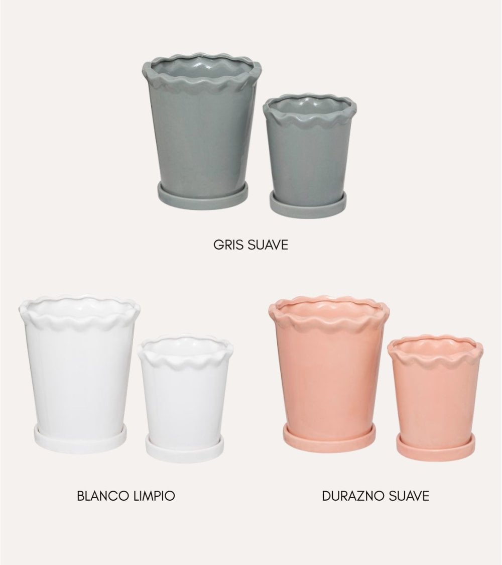 El diseño de cada maceta presenta un borde ondulado, que aporta un toque romántico y juguetón. La suavidad de sus líneas crea una sensación orgánica, ideal para complementar tus plantas favoritas. Disponibles en tres colores elegantes: