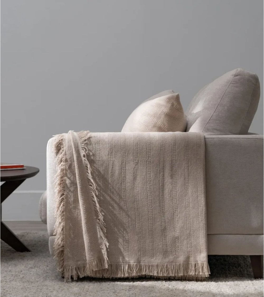 Manta de Tejido Fino de Algodón Reciclado presenta un diseño sutil con un patrón texturizado que añade profundidad visual sin ser invasivo. Los bordes terminados con una delicada flecos aportan un detalle casual que realza su aspecto acogedor.