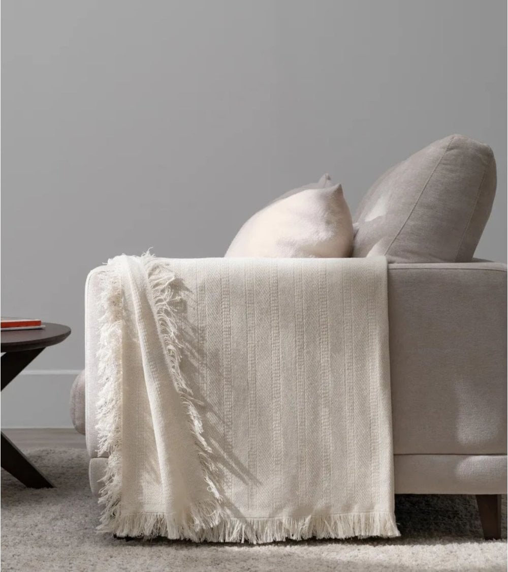 Manta de Tejido Fino de Algodón Reciclado presenta un diseño sutil con un patrón texturizado que añade profundidad visual sin ser invasivo. Los bordes terminados con una delicada flecos aportan un detalle casual que realza su aspecto acogedor.