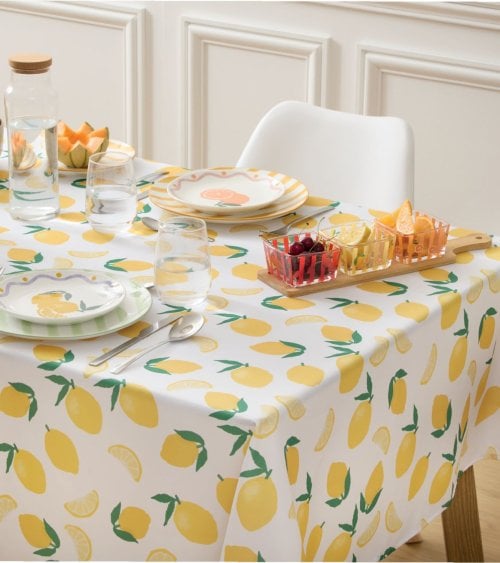 El mantel está confeccionado en poliéster de alta calidad, lo que garantiza una excelente resistencia a las manchas y facilita su limpieza. Su patrón repetitivo de limones enteros y rodajas, acompañado de hojas verdes sobre un fondo blanco brillante, aporta un aire veraniego que transforma cualquier comida en una experiencia más agradable y colorida.