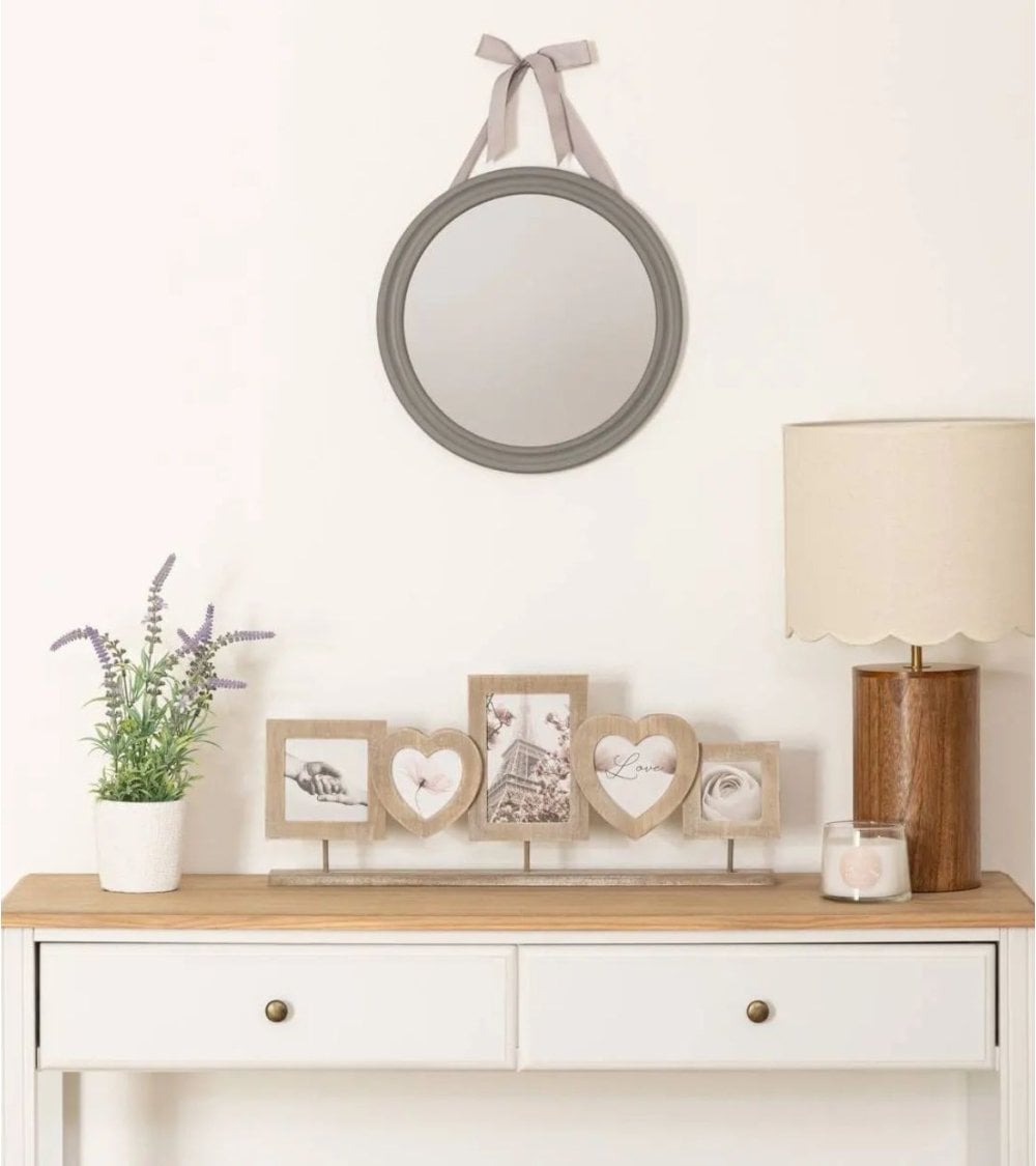 El diseño único del Marco de Fotos Múltiple Charm destaca por sus cinco aperturas para fotografías: una rectangular grande acompañada por tres marcos en forma de corazón que resaltan la temática sentimental. Además, uno de los corazones incluye la palabra Love en una tipografía estilizada, reforzando el mensaje afectivo que este producto transmite.