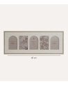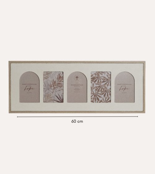 Aberturas para Fotos: Este marco cuenta con cinco aberturas arqueadas que permiten una presentación creativa de sus imágenes. Las aberturas laterales presentan tarjetas beige con inscripciones como "WHERE FLOWERS BLOOM" y "hope", mientras que los segmentos centrales están adornados con delicados diseños botánicos en tonos apagados.