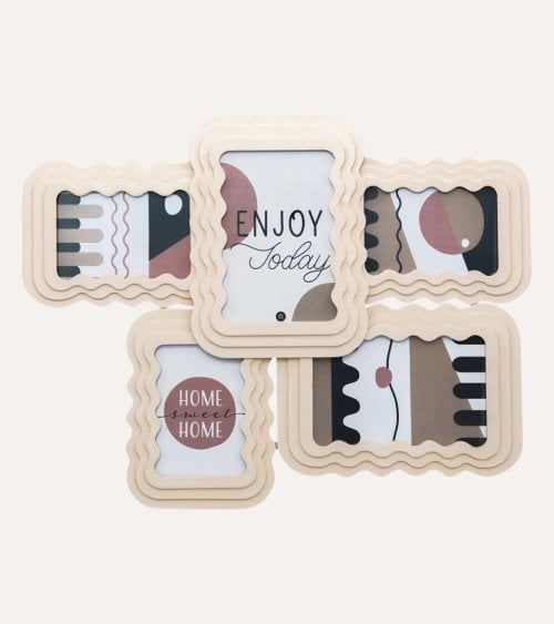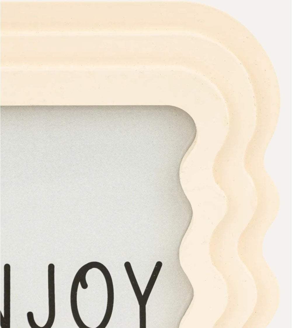 El Marco de Fotos Creamy, diseñado para estar en posición vertical sobre una mesa o escritorio, cuenta con un pequeño caballete en la parte posterior para un ángulo perfecto y visibilidad óptima. Su diseño inspirador muestra el texto ENJOY Today y formas abstractas en tonos suaves, convirtiéndolo en una pieza decorativa y motivacional. Fabricado en MDF resistente y duradero, su color crema suave complementa cualquier decoración. Con bordes ondulados para un toque moderno, es ideal para fotos de 13 x 18 cm o citas inspiradoras.