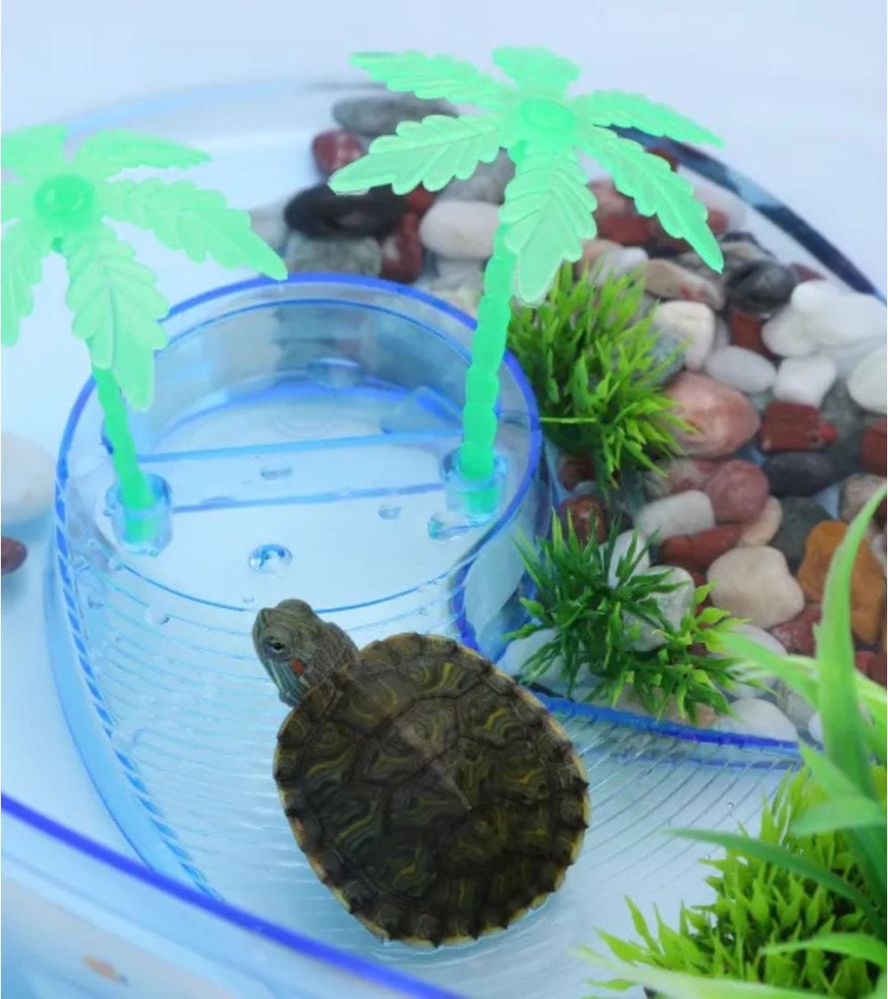 - Palm Trees Decorativas: Dos palmeras verdes añaden un toque tropical y ofrecen refugio a las tortugas.