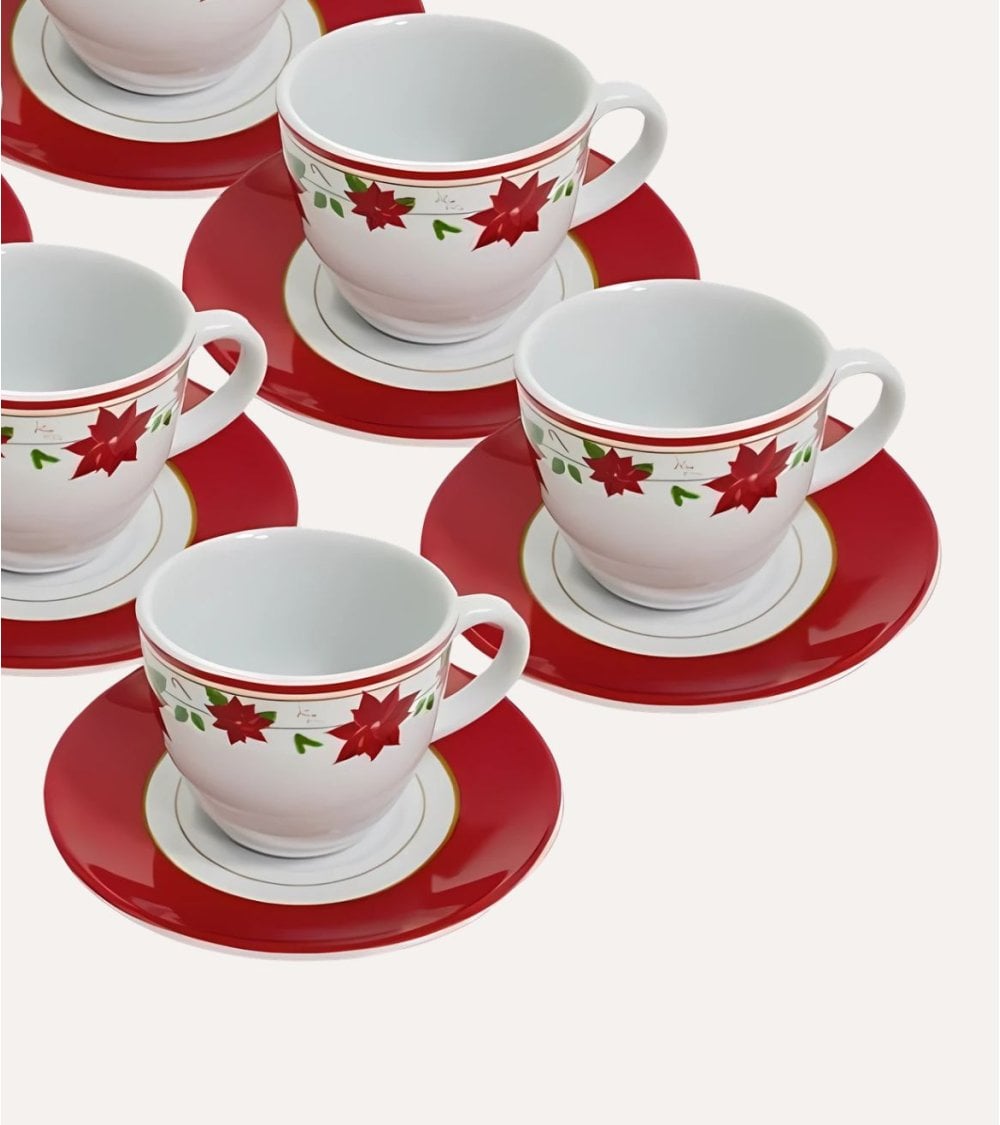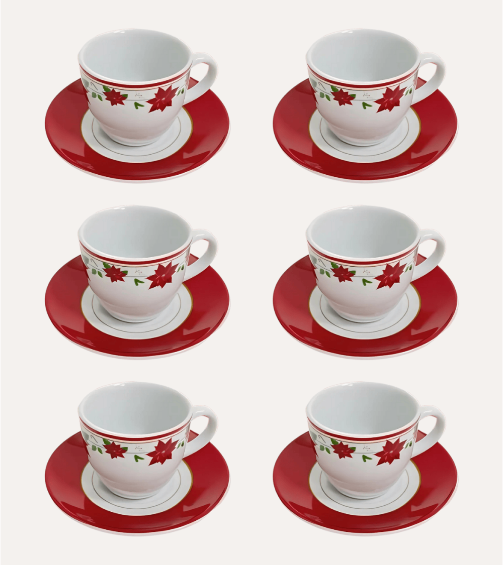Set de 6 Tazas y Platos Flor de Navidad de Cerámica