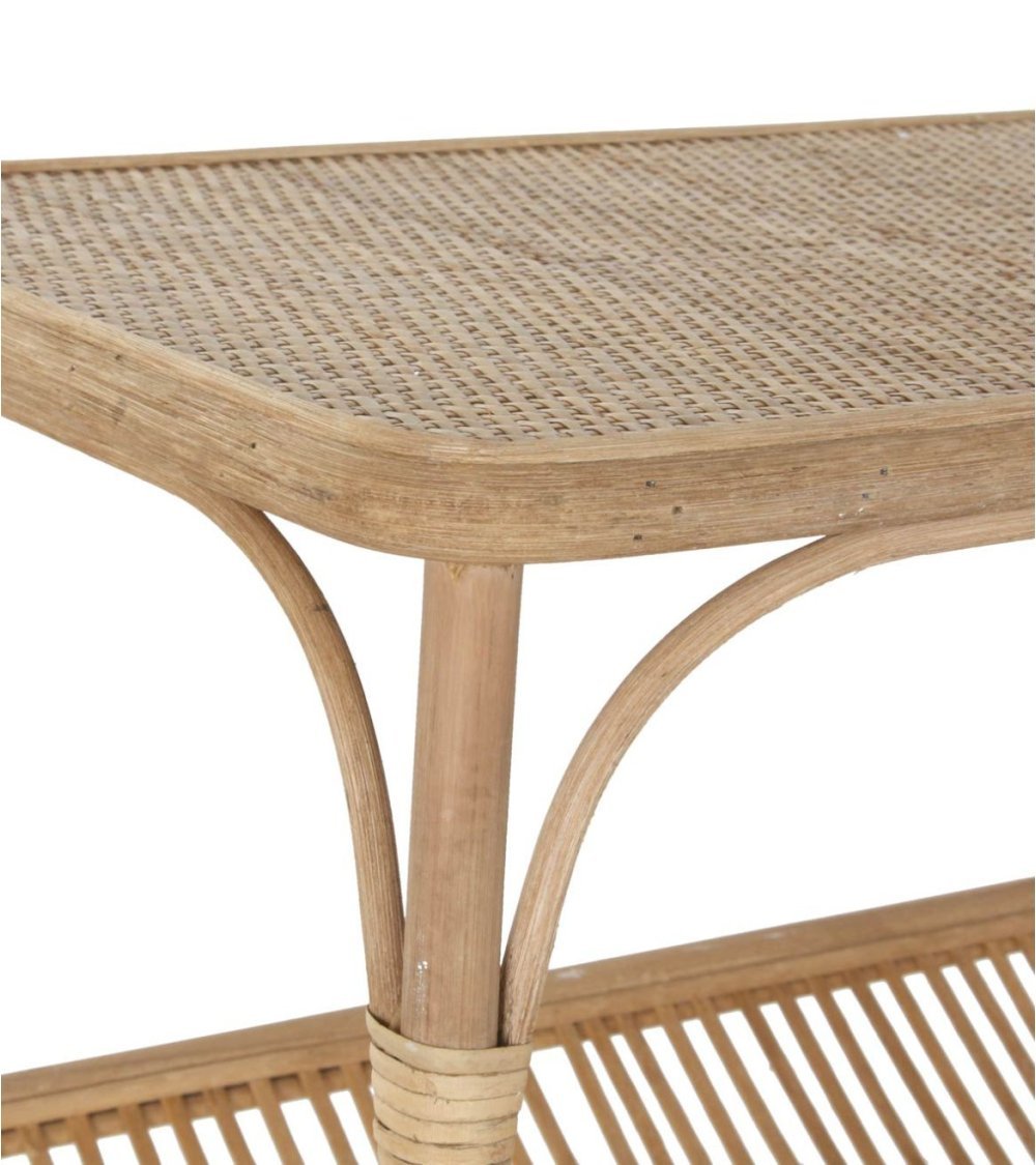 Mesita auxiliar fabricada en ratán natural y con un almacenamiento en la parte inferior para revistas o libros.
