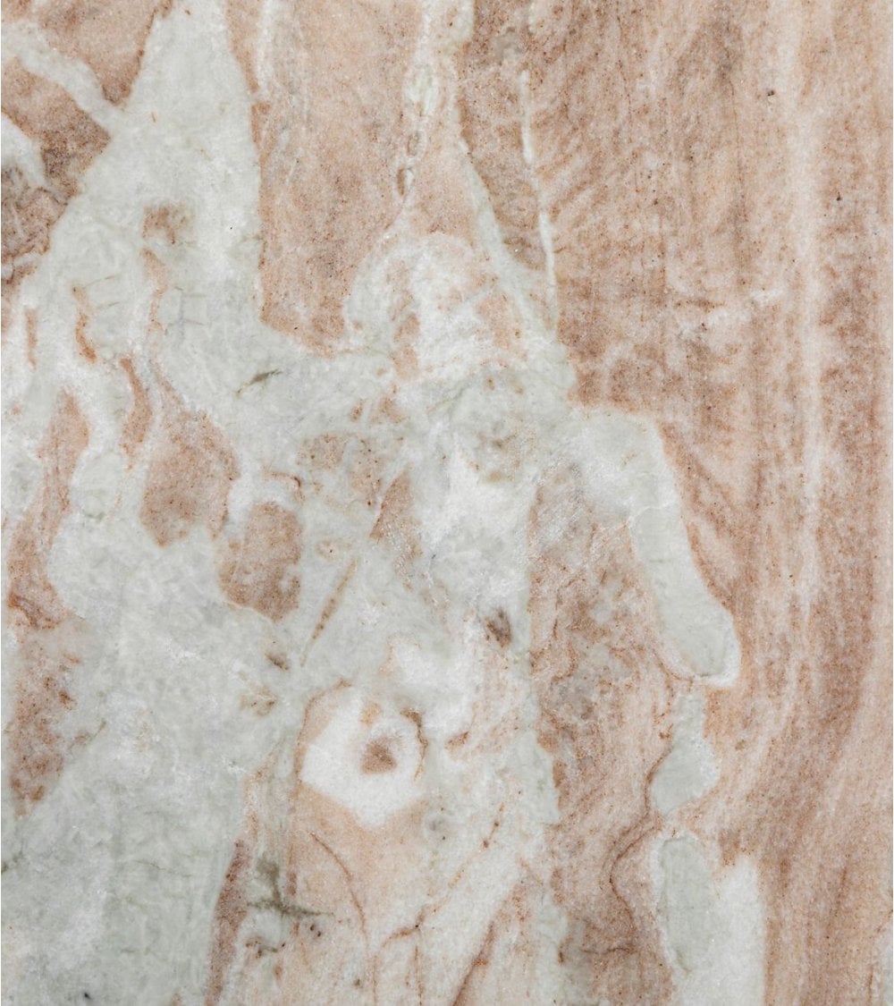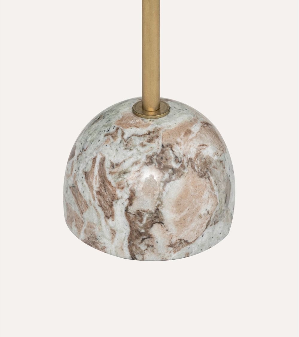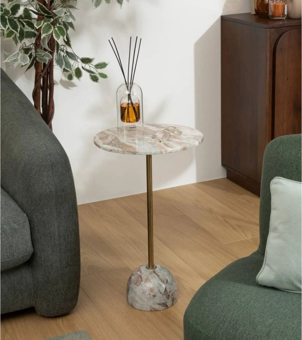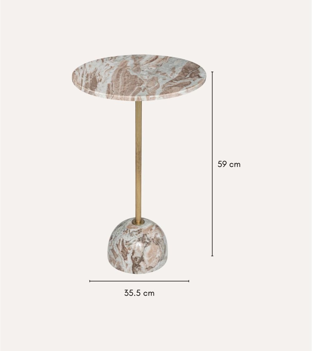 Su superficie redonda está elaborada con un material que imita el mármol, mostrando una mezcla armoniosa de tonos suaves como blanco, rosa pálido y vetas grises sutiles. Este acabado pulido no solo realza la belleza visual sino que también facilita su limpieza y mantenimiento. La base y el soporte están fabricados en acero con un acabado mate o cepillado en tono dorado cálido o latón, lo que añade un aire de lujo sin perder estabilidad ni resistencia.