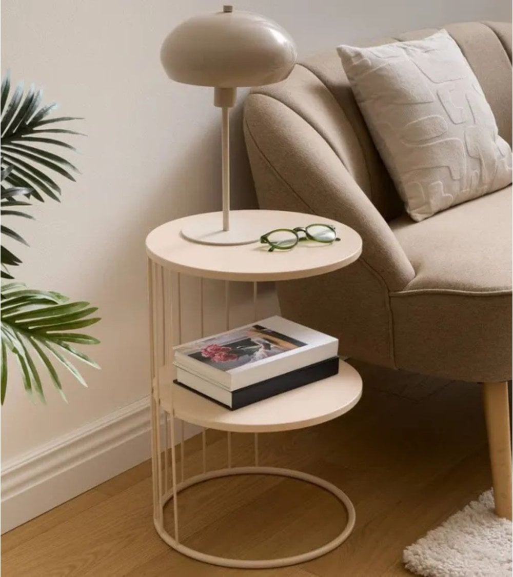 Esta mesa auxiliar es perfecta para colocar junto a sofás o camas gracias a su altura moderada, proporcionando comodidad sin sacrificar estilo. Su base circular garantiza estabilidad mientras que los dos niveles permiten organizar tus objetos personales de manera práctica y estética.