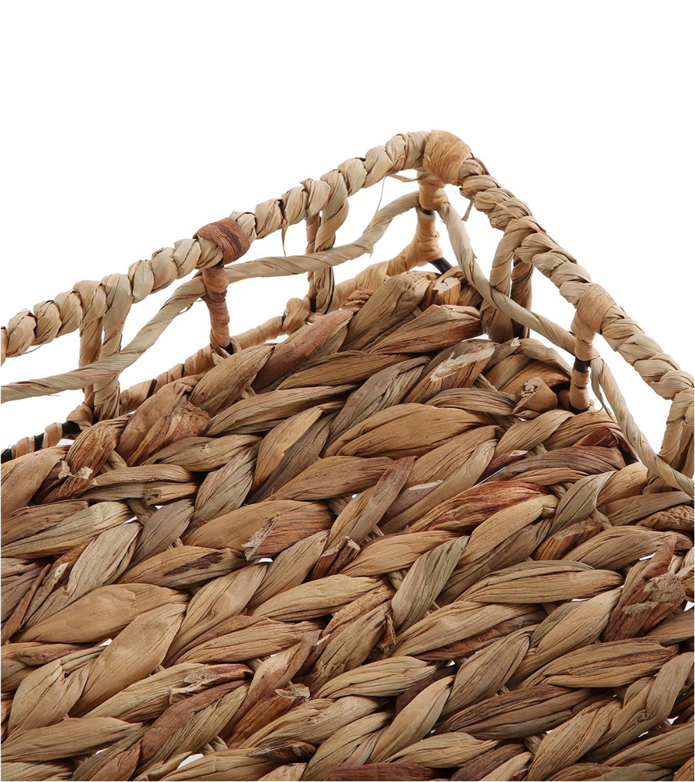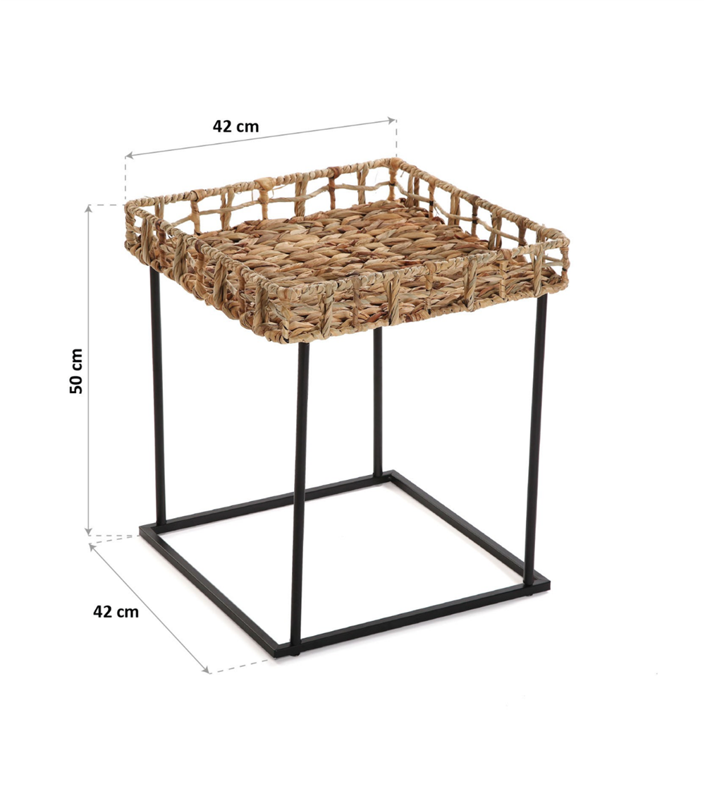 Mesa auxiliar cuadrada fabricada con fibra natural trenzada y estructura metálica en color negro.