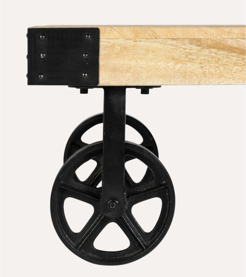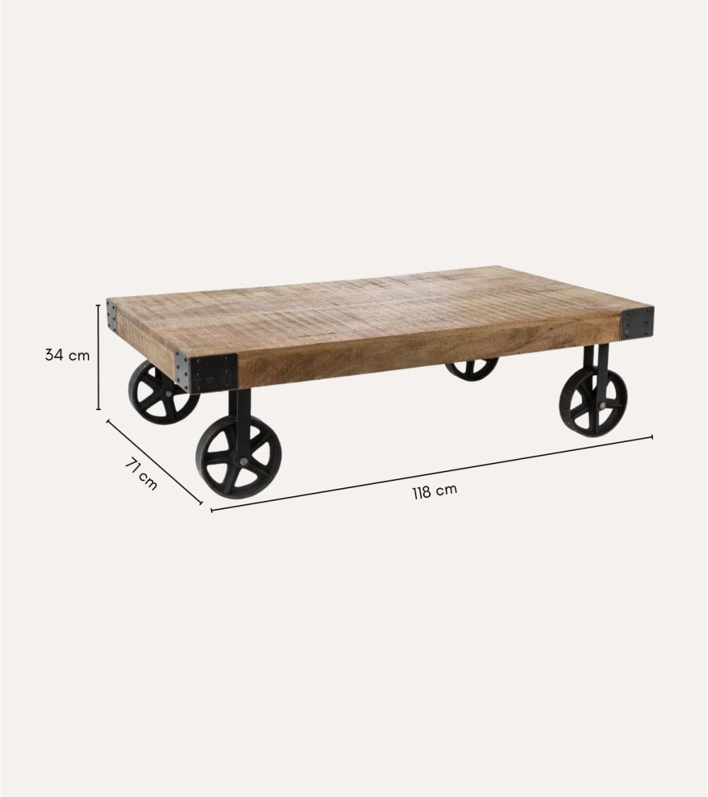 Esta mesa de centro baja rectangular con bordes redondeados es perfecta para cualquier estilo interior. Fabricada en madera de mango, su superficie presenta un acabado natural que resalta las texturas únicas del material. Su estructura robusta de metal negro proporciona estabilidad y un contraste atractivo. Con dimensiones de 118 x 71 x 34 cm, esta mesa cuenta con ruedas metálicas de diseño industrial que permiten reubicarla fácilmente según sus necesidades. El tono cálido de la madera se combina con el acabado negro mate del metal, creando una superficie suave pero natural, complementada por la textura ligeramente áspera del metal.