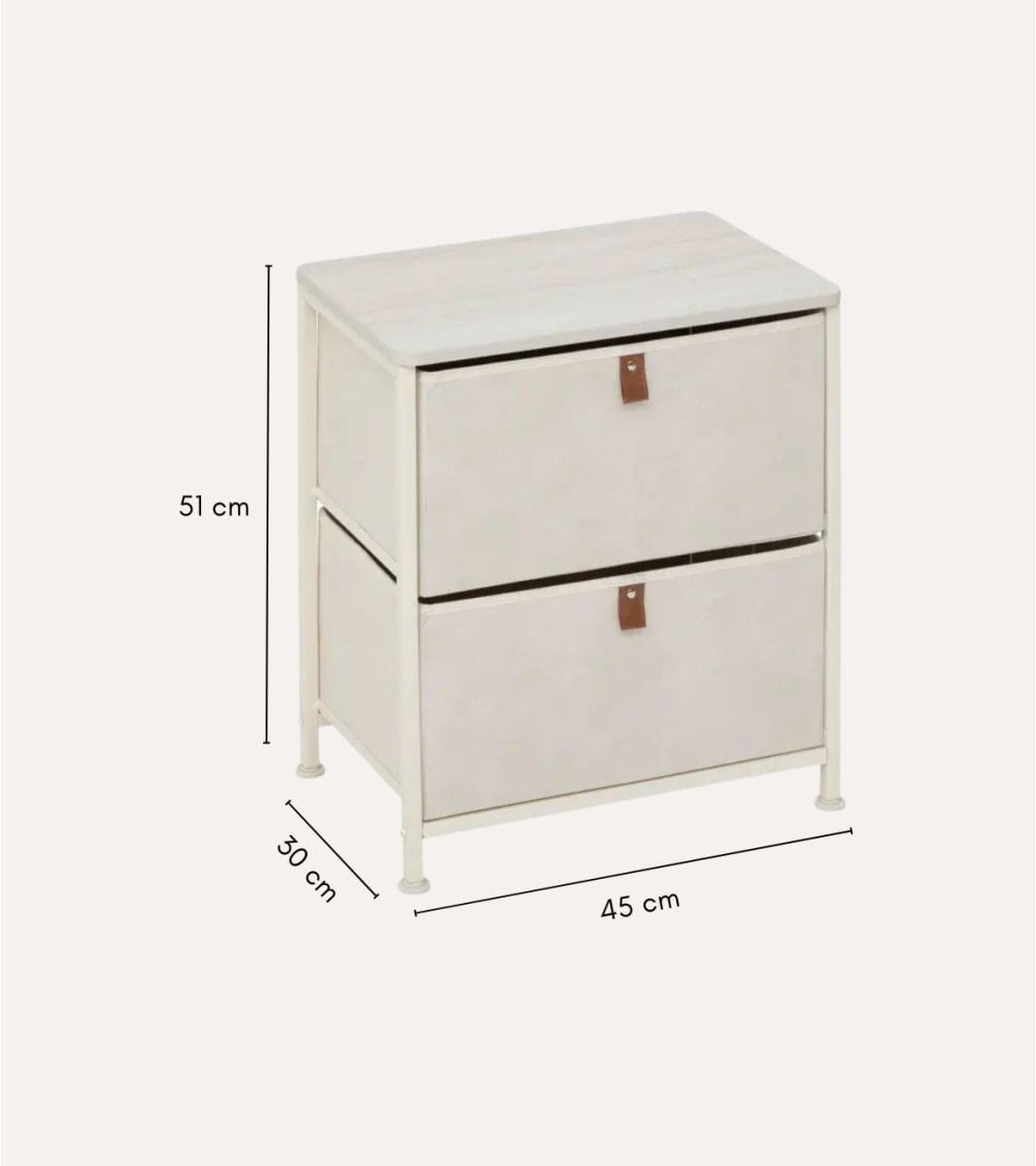 Fabricada con una estructura robusta de acero, esta mesita garantiza estabilidad y resistencia, mientras que sus dos cajones están elaborados en MDF con un acabado suave que aporta un toque cálido y sofisticado. Su color crema neutro permite integrarla fácilmente en diferentes estilos decorativos, desde el contemporáneo hasta el minimalista o rústico.