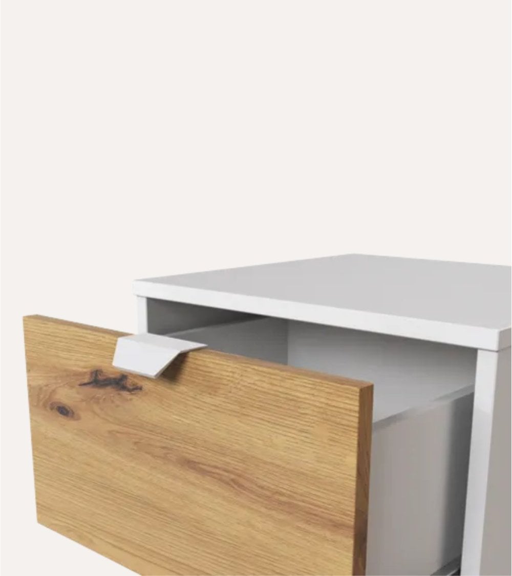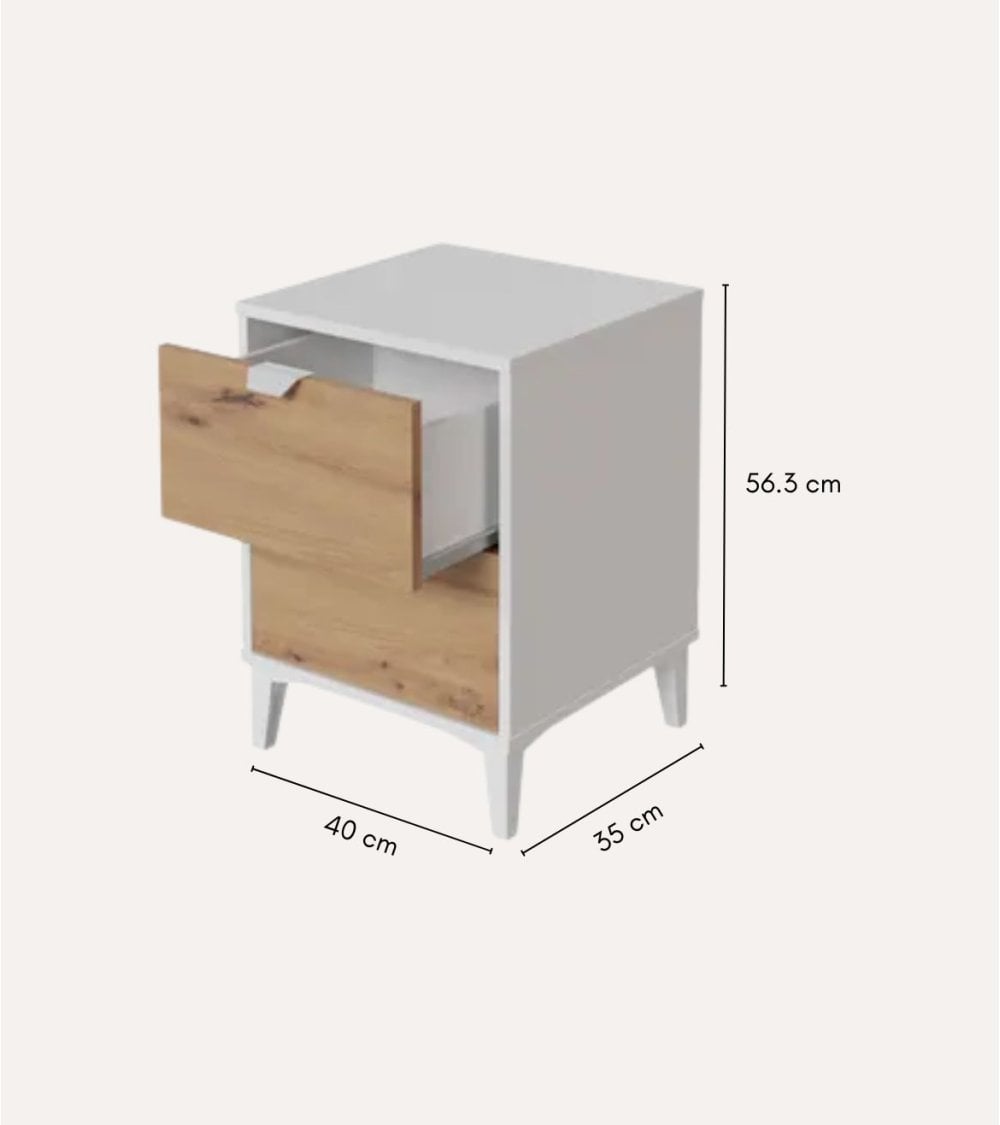 Su estructura en melamina de alta calidad simula la calidez de la madera, aportando un toque acogedor a cualquier ambiente. El contraste entre el cuerpo blanco y los frentes en tono madera clara crea un efecto contemporáneo y muy combinable con distintos estilos decorativos: nórdico, minimalista o incluso más clásico. Gracias a sus dos cajones espaciosos, podrás organizar desde libros y gafas hasta cargadores, productos de cuidado personal y pequeños accesorios.