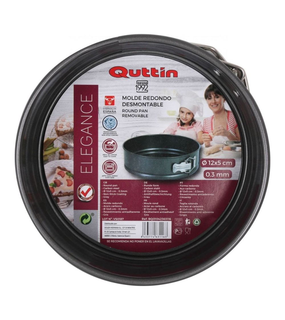 Molde Redondo Desmontable Quttin, ideal para tus reposterías caseras. Con medidas de 12 x 5 x 12 cm y un espesor de 0.3 mm, este molde garantiza resultados perfectos en cada uso. Fácil de desmontar y limpiar, perfecto para tartas y pasteles. Calidad y durabilidad de la marca Quttin.
