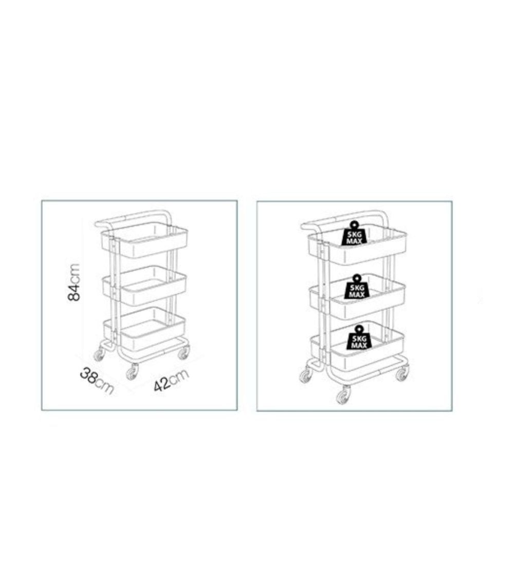 - Material: Su estructura es Metálica lo que garantiza su durabilidad y resistencia, y las bandejas del fondo de cada estante son plásticas.