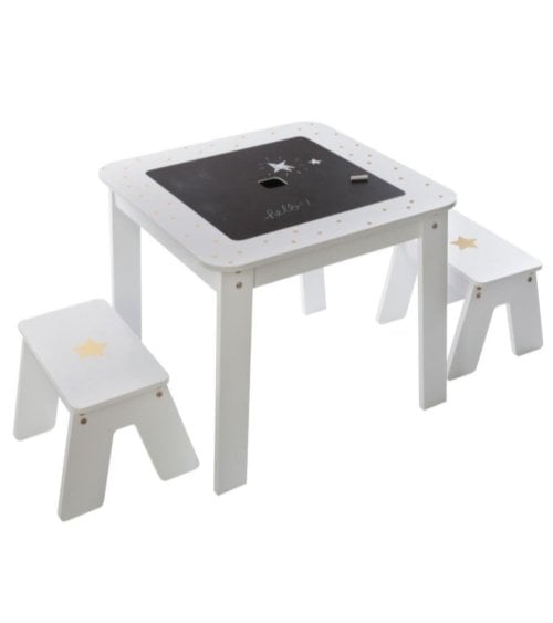 Además, la mesita cuenta con dos áreas de almacenamiento: un cajón cerrado para guardar objetos personales o juguetes pequeños, y un compartimento abierto perfecto para libros o artículos que quieras tener siempre a mano. Su tamaño compacto la hace perfecta para habitaciones pequeñas sin sacrificar funcionalidad.