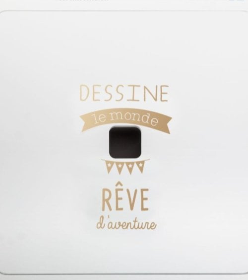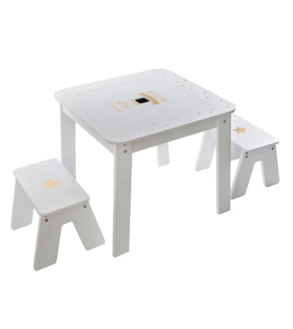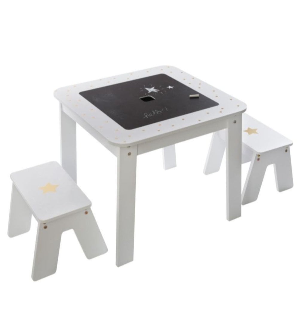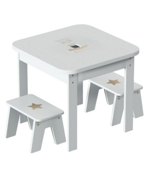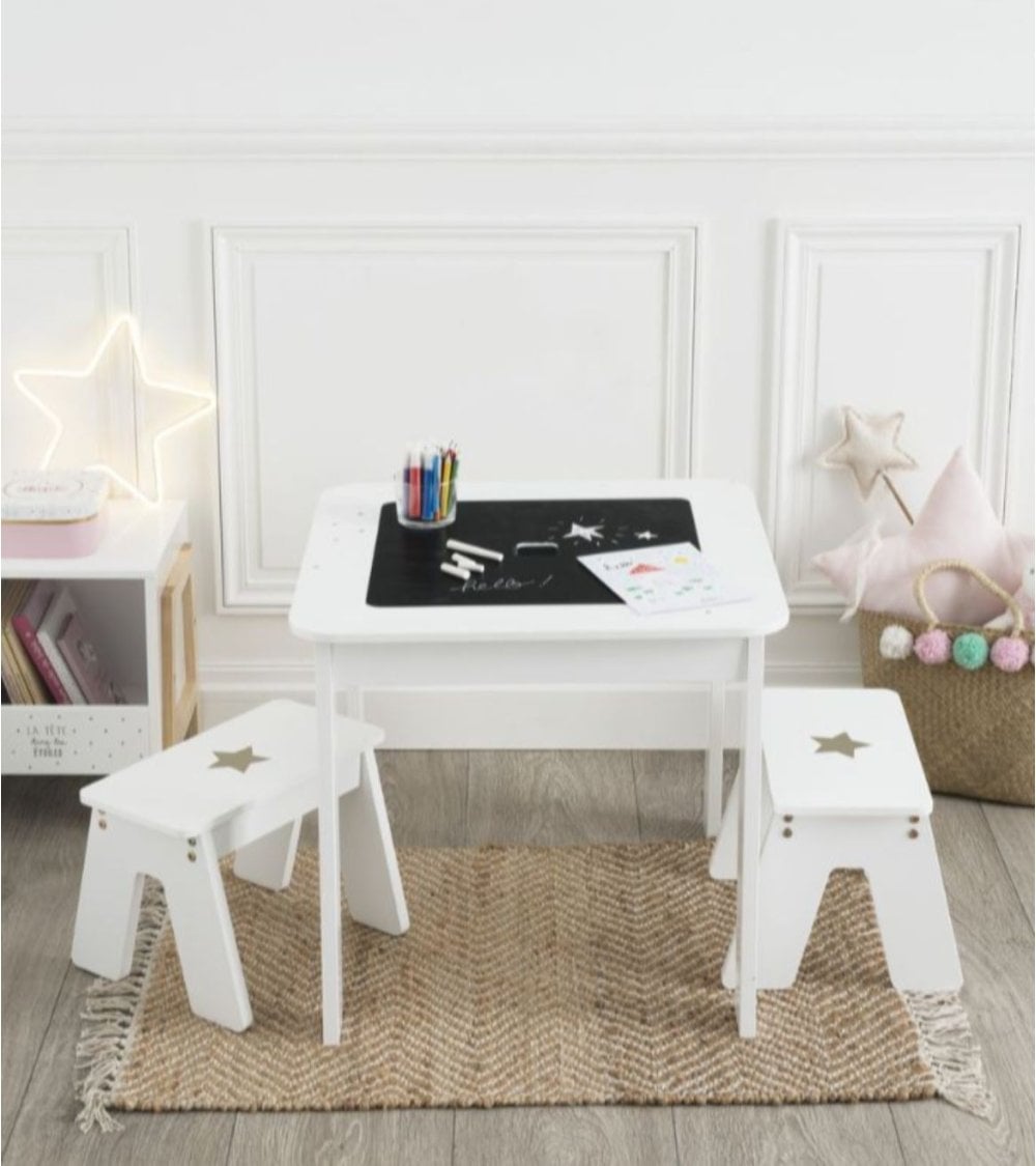 Descubre el conjunto perfecto para un dormitorio infantil en color blanco mate: nuestra Mesa Infantil con Tapa Reversible taburetes diseñada pensando en la funcionalidad. Los taburetes, adornados con serigrafías de estrellas en dorado, complementan la estética moderna y alegre del conjunto. La mesa no solo es un lugar para dibujar o leer, sino que también cuenta con almacenaje integrado para mantener los materiales de arte y juguetes bien organizados. A destacar, su tablero reversible, adaptándose a diferentes actividades y necesidades. En una parte, el tablero dispone de una pizarra. Fabricada en melamina de alta calidad, esta mesa garantiza un fácil mantenimiento. Inspiradora y práctica, la frase motivacional en la mesa invita a los niños a soñar y crear en un espacio que es todo suyo. Ideal para cualquier rincón infantil, este conjunto es el regalo perfecto para fomentar la creatividad y el orden. ¡Descubre su magia!
