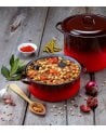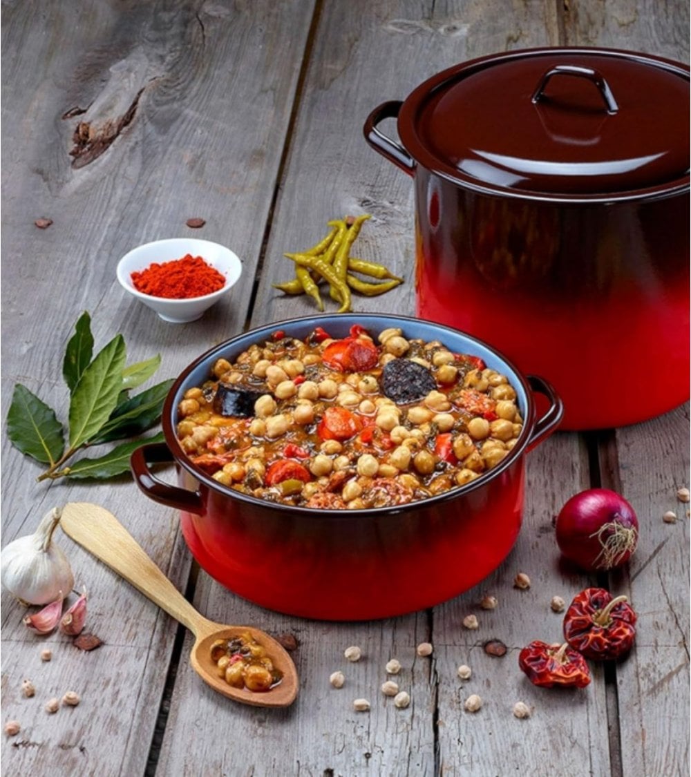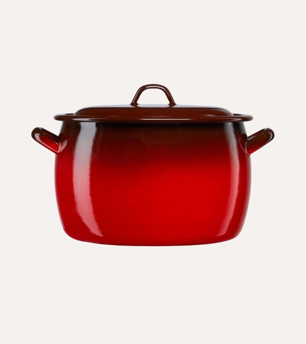 Esta olla está elaborada en acero esmaltado, un material reconocido por su resistencia al desgaste y facilidad de limpieza. Su diseño abombado permite una distribución uniforme del calor, ideal para cocinar a fuego lento, hervir o preparar guisos deliciosos. Además, su tapa ajustada ayuda a conservar la humedad y los sabores durante la cocción.