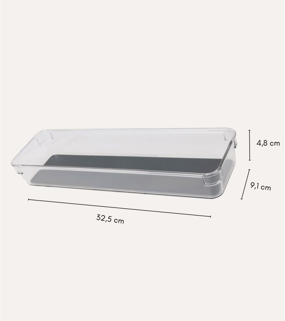 En ALI Hogar, ofrecemos la Cubeta Organizadora Antideslizante de Plástico, perfecta para mantener tu espacio ordenado y funcional. Esta cubeta, fabricada con plástico transparente, optimiza el espacio en tu hogar u oficina, permitiendo visualizar fácilmente su contenido. Su diseño rectangular y alargado es ideal para espacios estrechos, y su base antideslizante garantiza estabilidad, evitando desplazamientos accidentales. Sus bordes redondeados aportan un toque moderno y seguro. Tamaño de 32,5 x 9 x 5 cm.