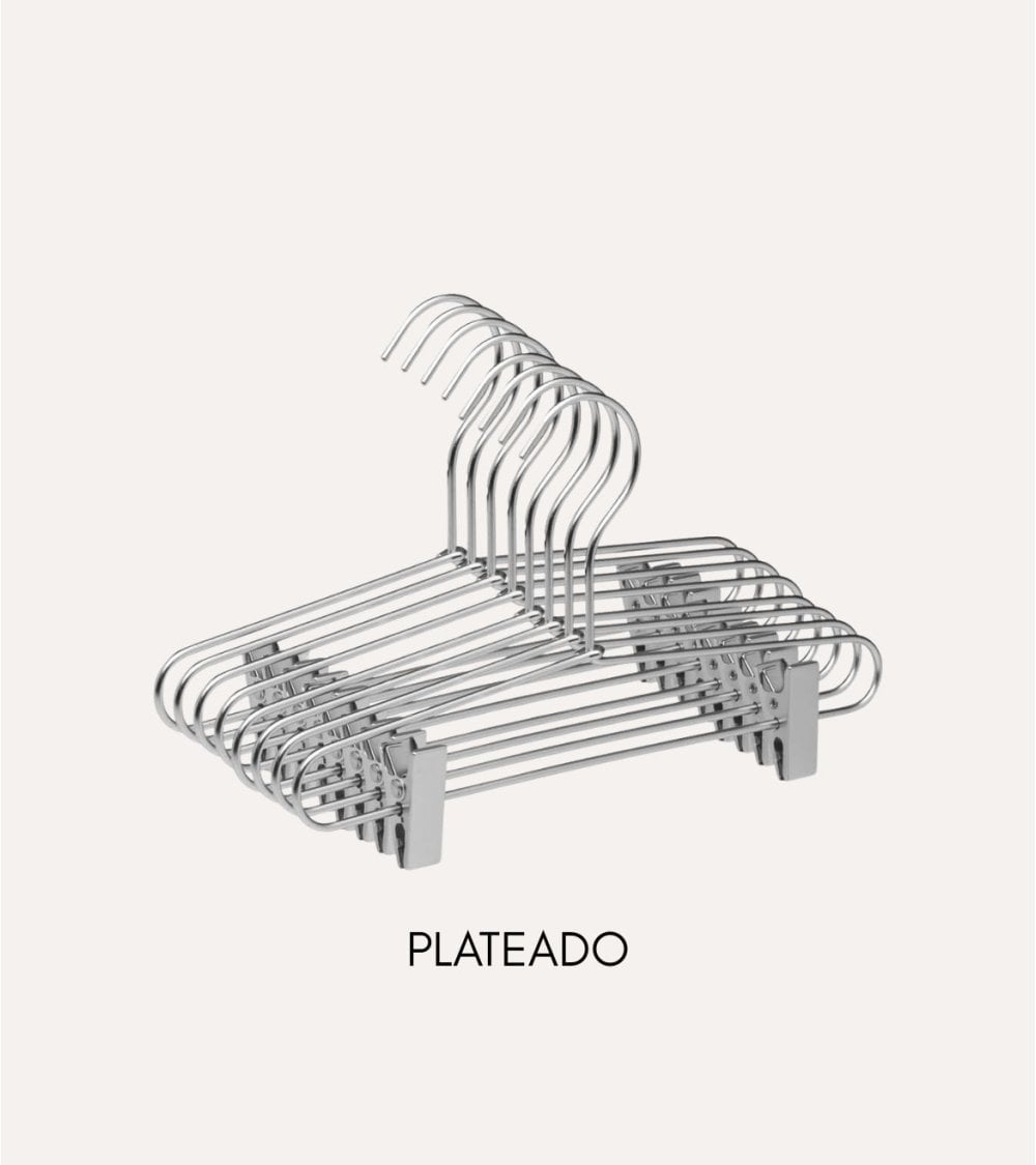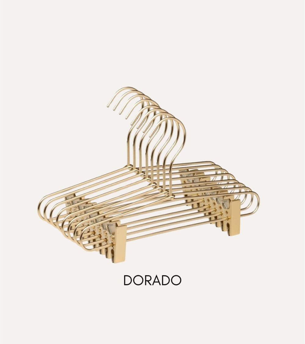 - Mecanismo de Clips: Equipadas con un sistema de clips centralizado, estas perchas aseguran que tus faldas y pantalones se mantengan firmemente sujetados.