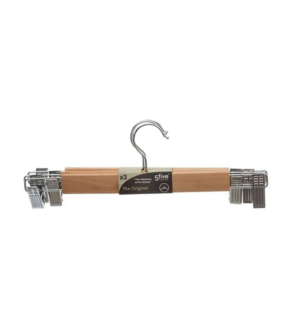 Este set de 3 perchas de madera con pinzas es ideal para mantener tu ropa en perfecto estado. Las pinzas permiten colgar prendas delicadas sin dañarlas, mientras que la madera aporta un toque de elegancia a tu armario. Este set es imprescindible para cualquier hogar que valore la organización y el cuidado de sus prendas.