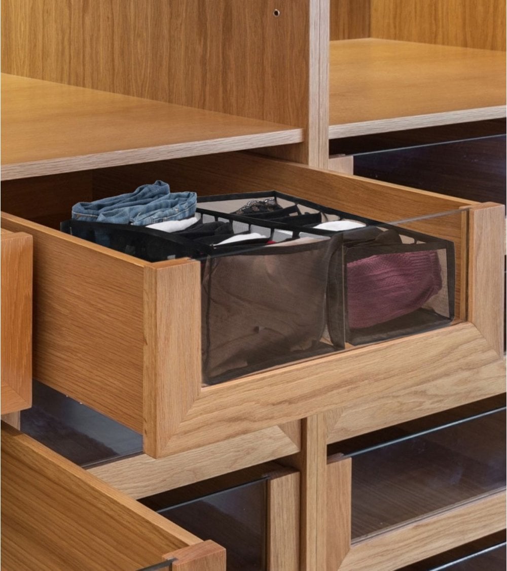 - Nueve compartimentos: su estructura dividida permite organizar hasta siete prendas o accesorios diferentes, facilitando la clasificación y el acceso rápido.