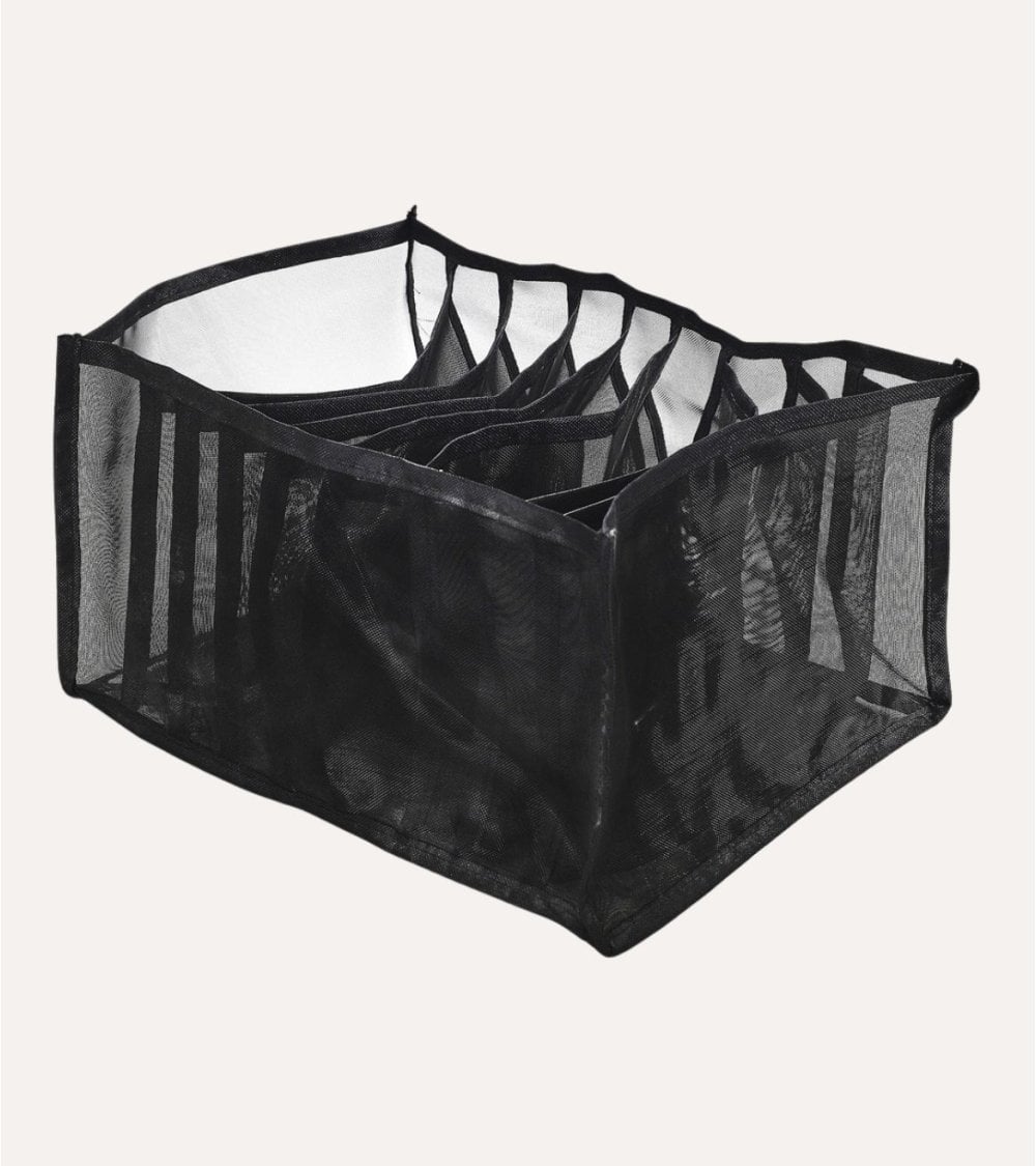 En ALI Hogar, ofrecemos el Organizador de 9 Prendas con Malla de Tela, una solución elegante para mantener tu ropa y accesorios ordenados. Este organizador optimiza el espacio en armarios, cajones o maletas, manteniendo todo en su lugar. Fabricado en poliéster resistente y malla transpirable, combina durabilidad con ventilación, evitando olores desagradables. Su diseño minimalista en negro se adapta a cualquier estilo decorativo. Con un tamaño de 32 x 25 x 17 cm., tiene nueve compartimentos para organizar prendas o accesorios, bordes reforzados para resistencia y durabilidad, y una apertura superior abierta para facilitar el uso.