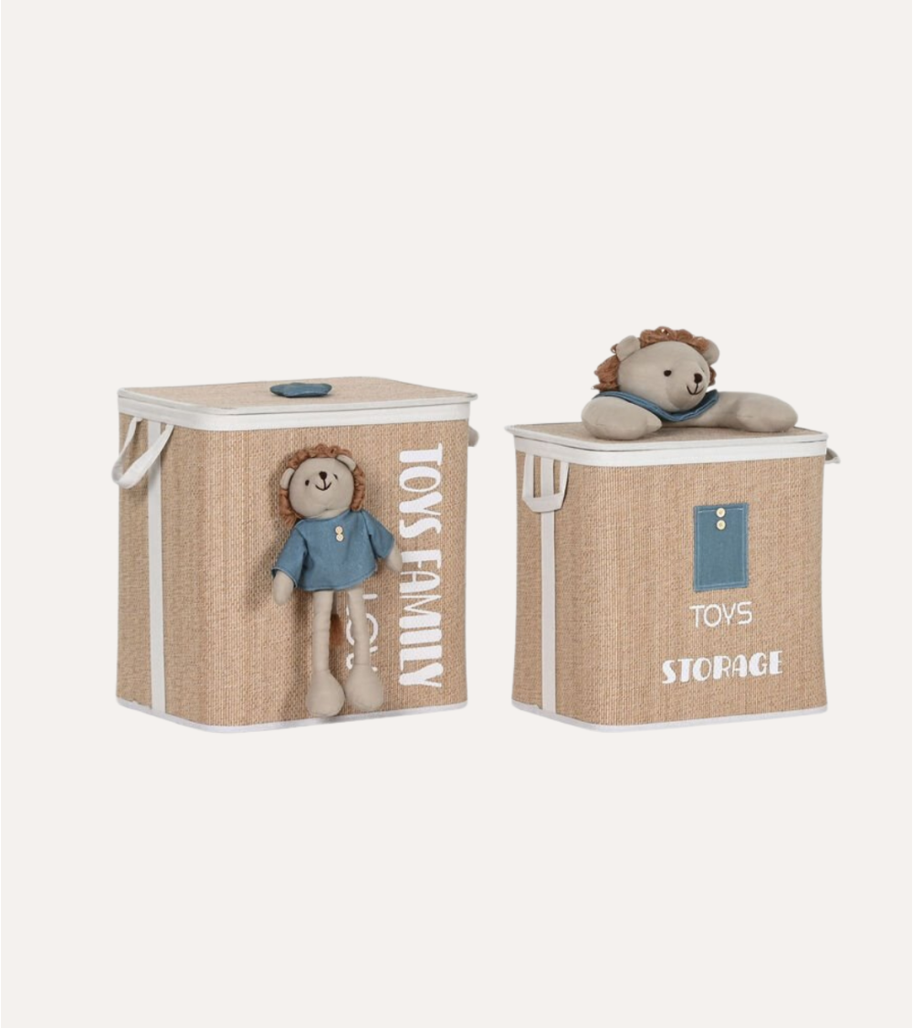 - Textos claros: Las palabras "TOYS" y "STORAGE" están impresas en letras blancas audaces, indicando su propósito sin confusiones.
