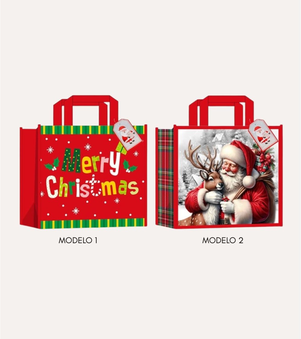 Disponible en dos modelos únicos, cada uno aporta un toque especial a tus regalos. El primer modelo destaca por su color rojo vibrante con texto multicolor que dice "Merry Christmas", acompañado de motivos tradicionales como copos de nieve y hojas de acebo, mientras que el segundo modelo presenta una ilustración entrañable de Santa Claus abrazando a un reno sobre un fondo nevado, complementado con un patrón a cuadros en verde y rojo en uno de sus laterales.