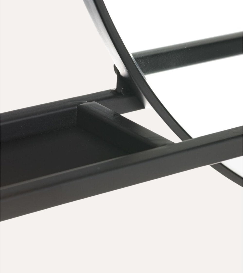 Este espejo cuenta con una superficie reflectante de vidrio de alta calidad, que garantiza una imagen clara y sin distorsiones. Su marco y estante están elaborados en metal resistente, acabado en un elegante color negro mate que aporta sofisticación y versatilidad a la decoración.