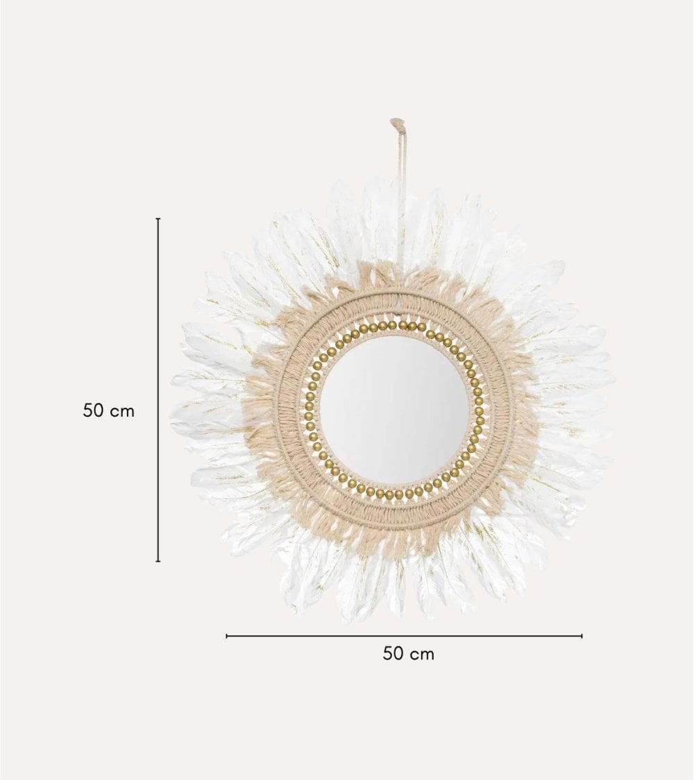 Fabricado con materiales de alta calidad como vidrio para el espejo y poliéster para las plumas del marco. Además, su acabado detallado resalta la textura suave y delicada del marco, haciendo que cada pieza sea única.