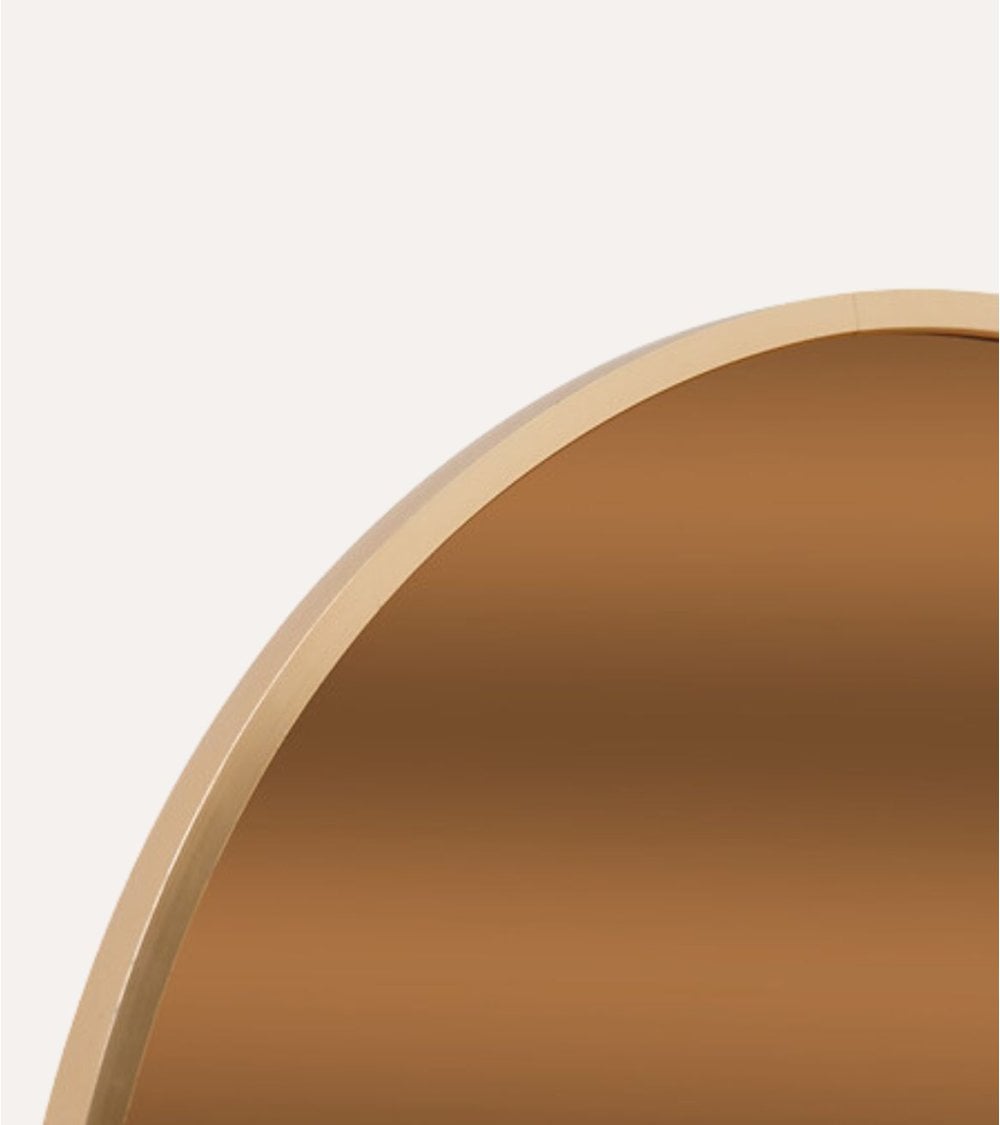 El marco del espejo está fabricado en aluminio, un material ligero pero resistente que garantiza durabilidad y un mantenimiento sencillo. La superficie del vidrio tintado no solo ofrece una reflexión clara sino que también añade profundidad visual y un efecto luminoso único, ideal para ampliar la sensación de espacio en cualquier habitación.