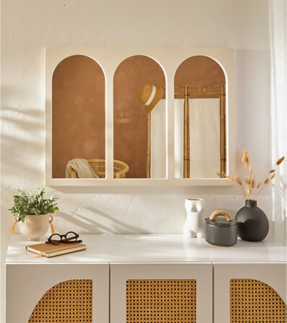 - Estructura y Diseño: Cada panel cuenta con un arco redondeado en la parte superior, lo que añade un detalle arquitectónico suave y elegante. Fabricado en MDF, este espejo no solo es duradero, sino que también presenta un acabado liso y moderno en color blanco, ideal para complementar diversos estilos decorativos.