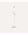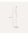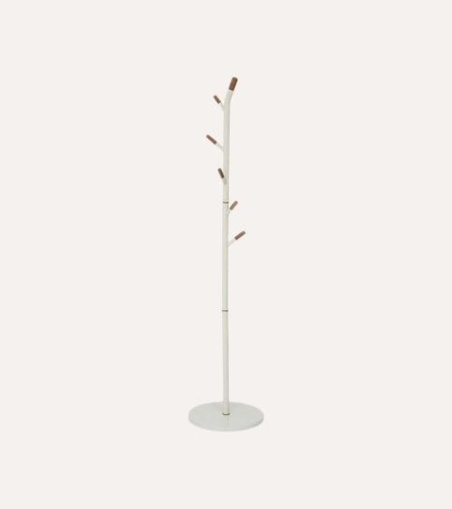 Su diseño se inspira en formas orgánicas, con un poste vertical estilizado que simula un tronco, complementado por ganchos horizontales que asemejan pequeñas ramas. Esta fusión entre metal resistente y madera cálida crea un contraste visual atractivo, disponible en dos colores modernos: blanco y verde, adaptándose fácilmente a diferentes estilos decorativos.