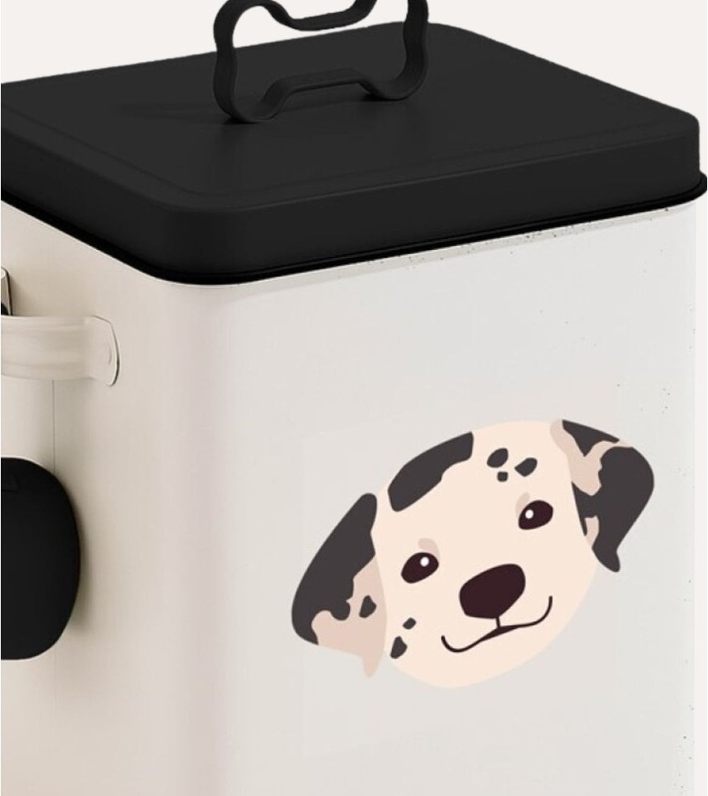 Este recipiente rectangular está elaborado en metal resistente, lo que garantiza una larga vida útil y protección contra golpes o desgaste diario. Su acabado blanco con tapa negra crea un contraste moderno y elegante, mientras que la ilustración divertida del rostro de un dálmata añade un toque único y amigable, ideal para quienes desean cuidar a sus mascotas con productos atractivos.