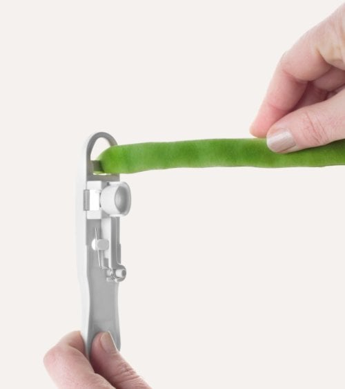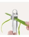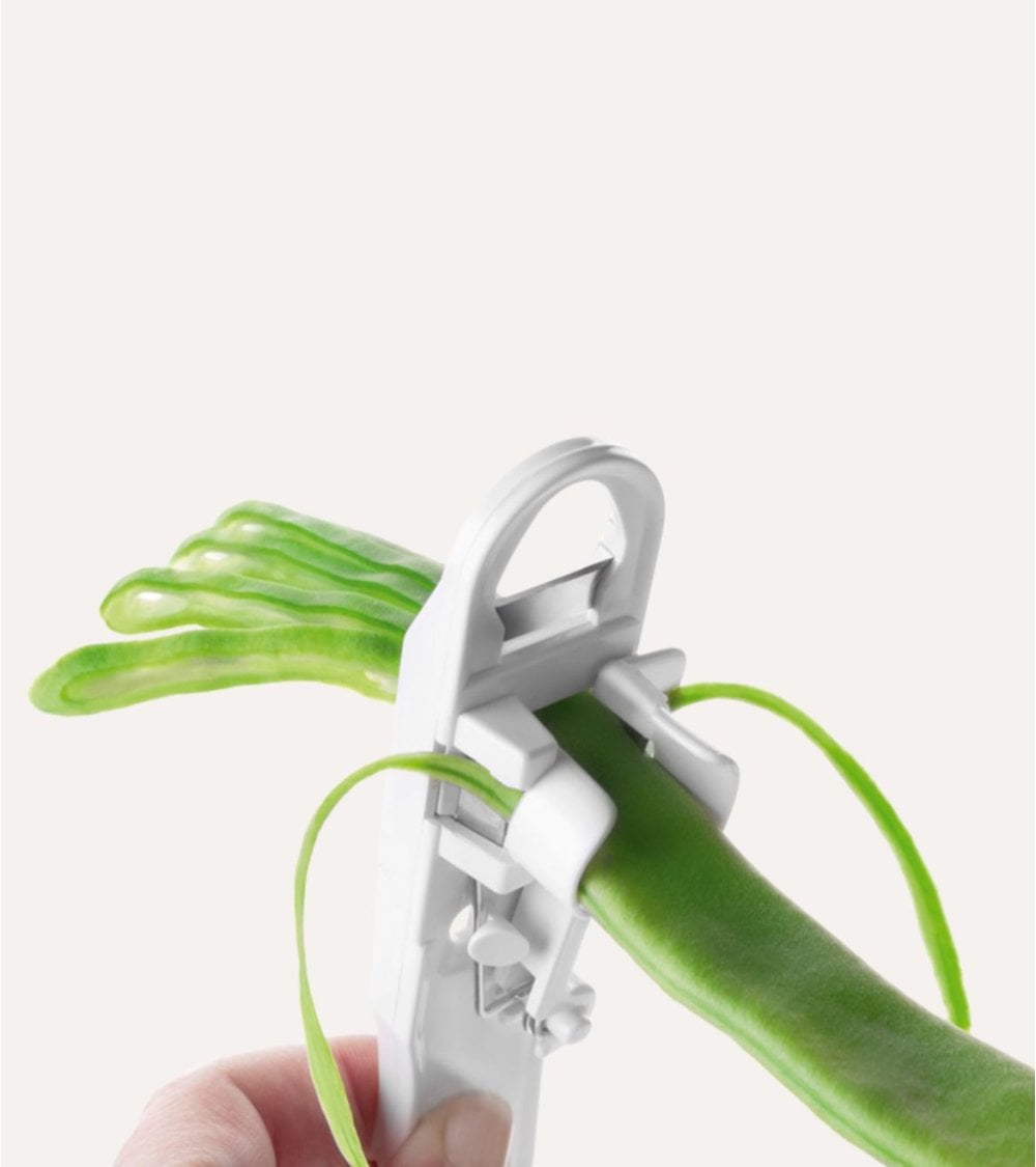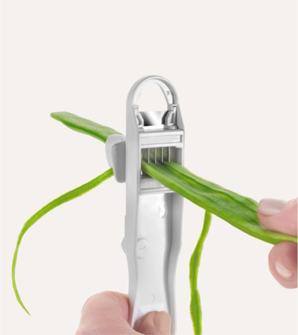 Este cortador está diseñado especialmente para pelar y cortar judías verdes u otros vegetales similares, agilizando tareas que suelen ser tediosas en la cocina. Su estructura alargada y estilizada permite un manejo sencillo, mientras que su material plástico resistente garantiza seguridad durante su uso.