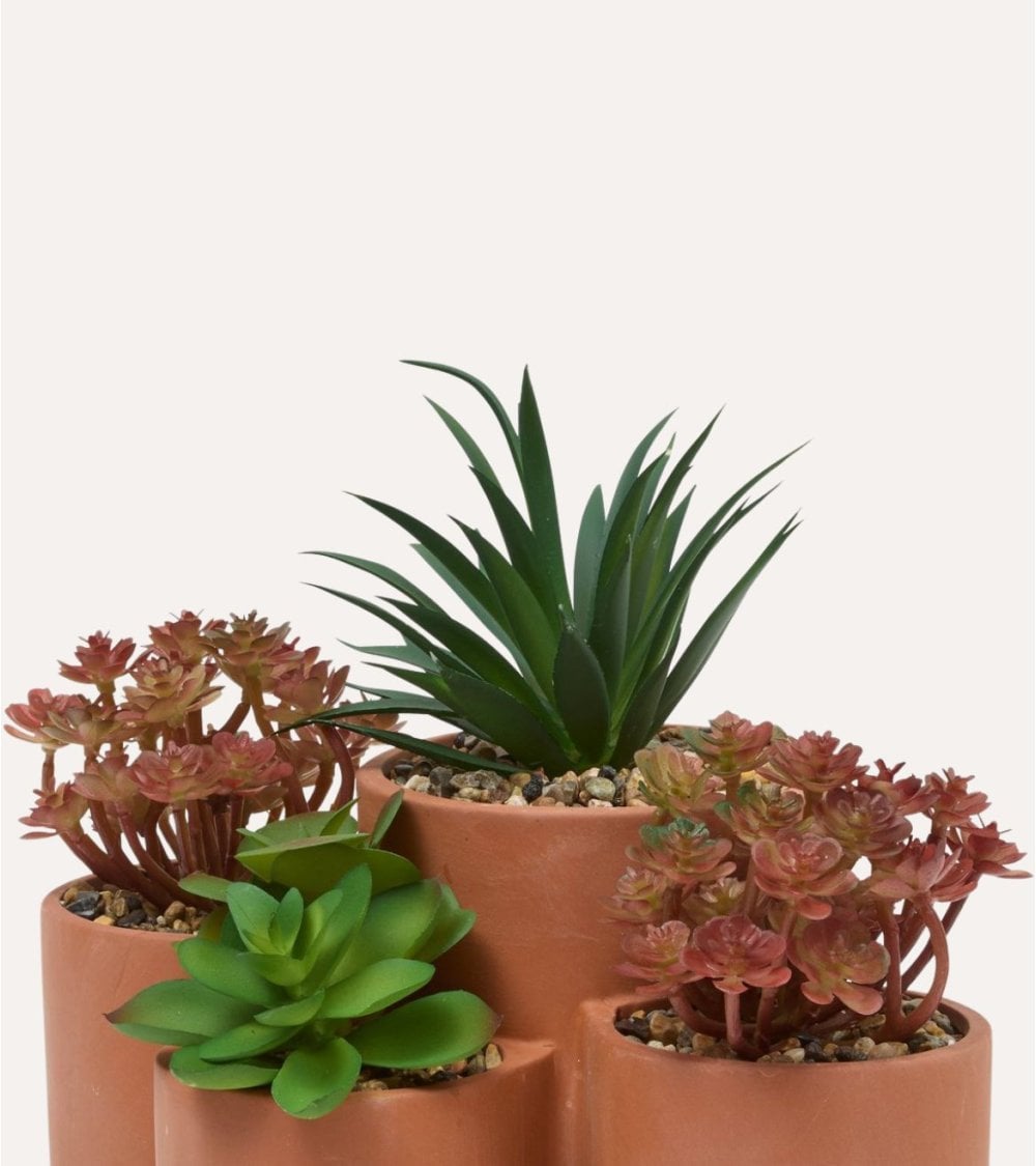 La maceta múltiple está diseñada con cuatro recipientes cilíndricos interconectados, fabricados en cerámica y plástico, materiales que garantizan durabilidad y ligereza. Su acabado mate aporta una textura suave que facilita la limpieza y mantenimiento, mientras que el color terracota natural armoniza perfectamente con las tonalidades verdes y rojizas de las suculentas.