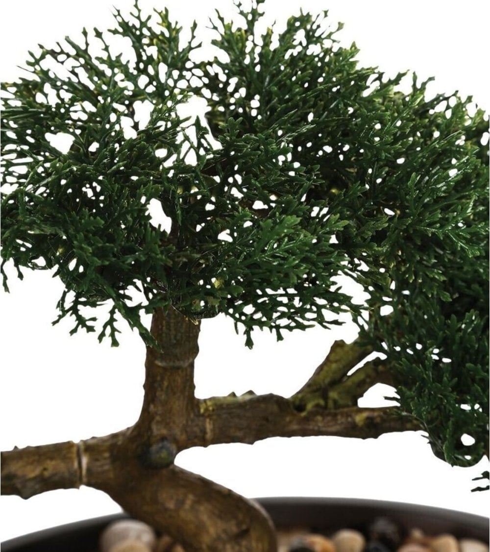Este bonsái artificial está elaborado en polietileno, un material que imita perfectamente la apariencia y textura real de un árbol, y cuenta con una maceta de cerámica de alta calidad en color negro con piedras en su interior para aumentar el realismo de esta.